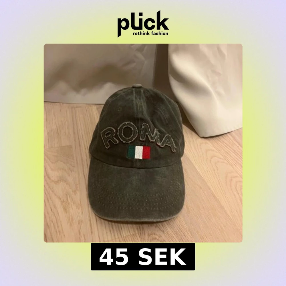 Olivgrön keps med broderad texten ROMA och Italiens flagga framtill. Från en marknad i Rom. Justerbar baktill för perfekt passform. Tillverkad i 100% bomull, perfekt för dig som gillar italiensk stil och streetwear-vibe.