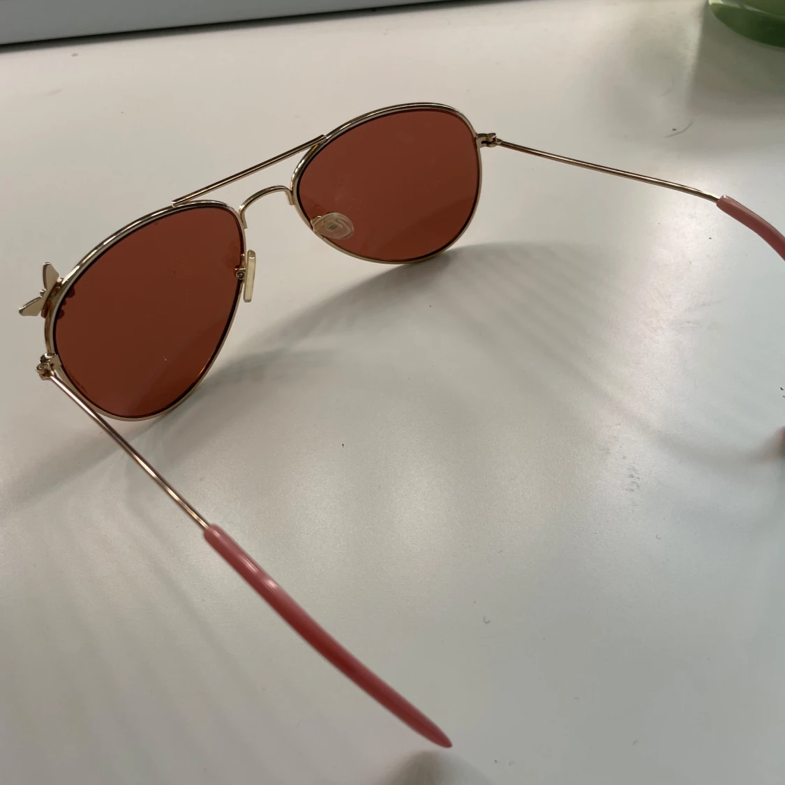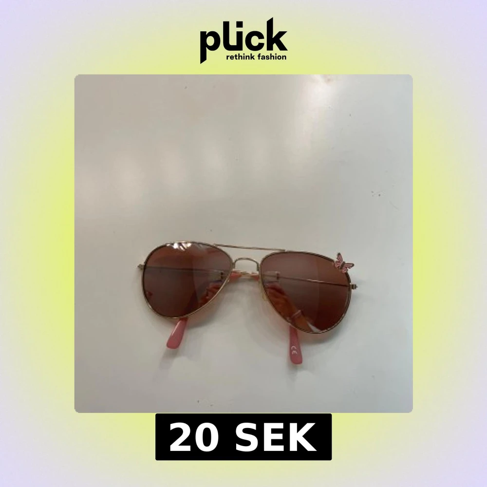 Snygga aviator-solglasögon med guldigt metallbåge och rosatonade glas. Skalmarna är rosa och på ena linsen sitter en liten rosa fjärilsdetalj som ger extra vibe. Perfekta för att lyfta din stil i sommar.