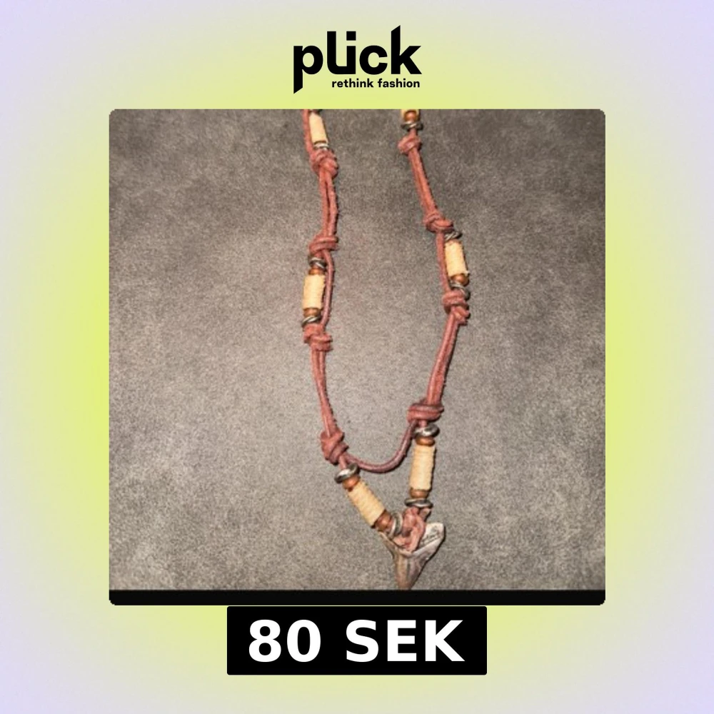 Unikt halsband med brun mockaliknande snodd, dekorerat med beige och bruna pärlor samt en cool hajtandsberlock i grått. Knytningar längs bandet ger en avslappnad vibe. Perfekt accessoar för dig som gillar en boho eller surf-inspirerad stil.