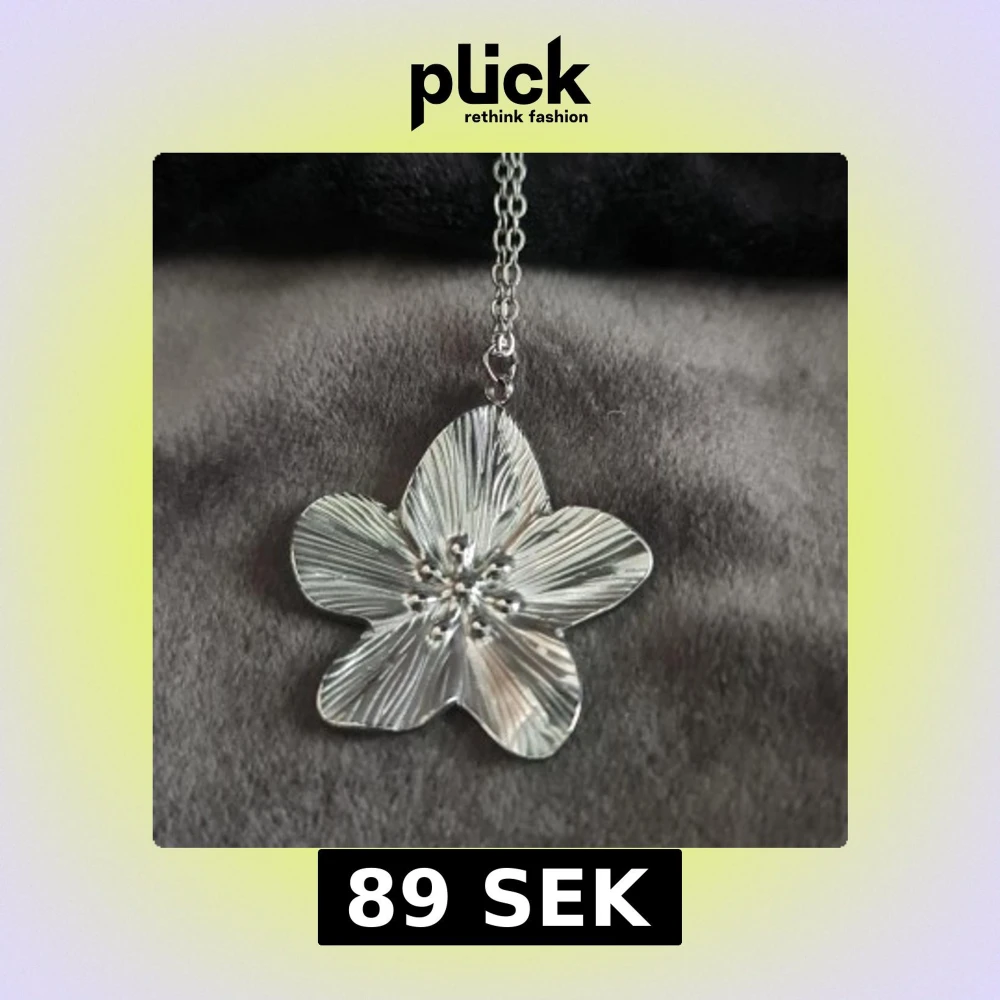 Unikt halsband med en stor, fembladig blomma som hängsmycke i silverfärgad metall. Blomman har detaljerade linjer och små upphöjda prickar i mitten som ger en cool och naturinspirerad vibe. Kedjan är tunn och matchar smycket perfekt. Perfekt för dig som gillar blommiga accessoarer.