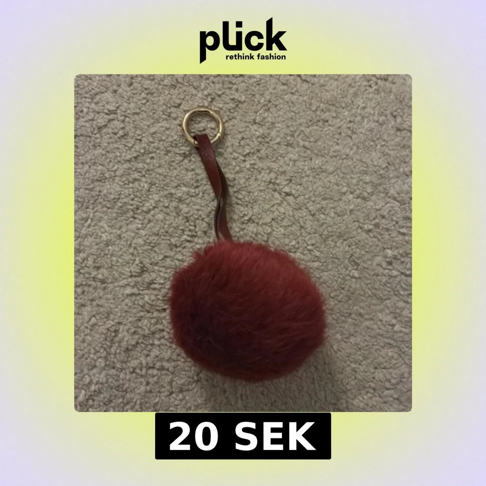 Säljer en vinröd pälsboll nyckelring med en guldfärgad ring och röd läderrem. Perfekt som accessoar till din väska eller nyckelknippa.