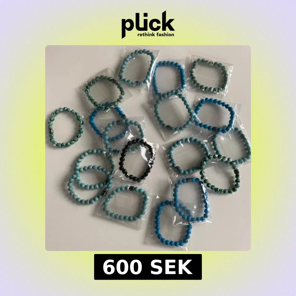 Säljer flera elastiska armband med runda pärlor, finns fyra olika sorter (dem som syns på bilderna). Några har marmorerat mönster och den svarta är mer matt av sig. Perfekta att mixa och matcha för en personlig stil. Vid intresse av köp skriv till mig privat innan så sätter jag upp en specifik annons just för dig. 40kr st men pris kan diskuteras vid intresse av mer än ett armband. Och vid andra frågor och funderingar är det bara att fråga på!