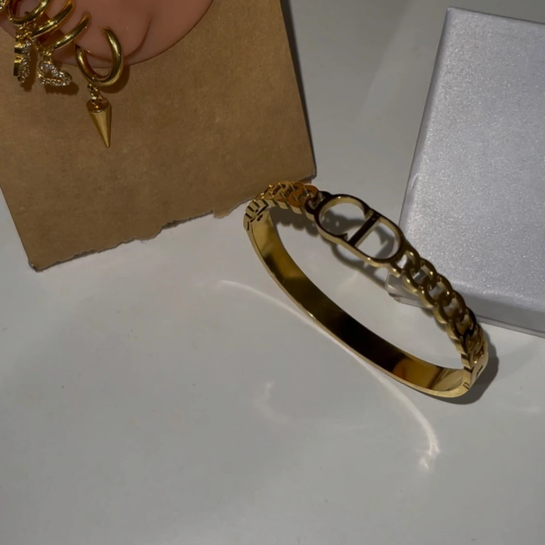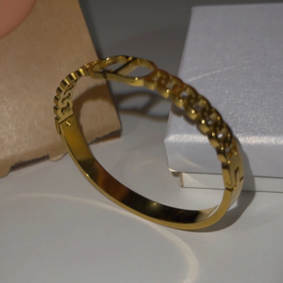 Elegant guldarmband med en stilren kedjedesign och en dekorativ detalj i mitten. Helt oanvänd och ny. Materialet är rostfritt stål med 18K guldplätering.