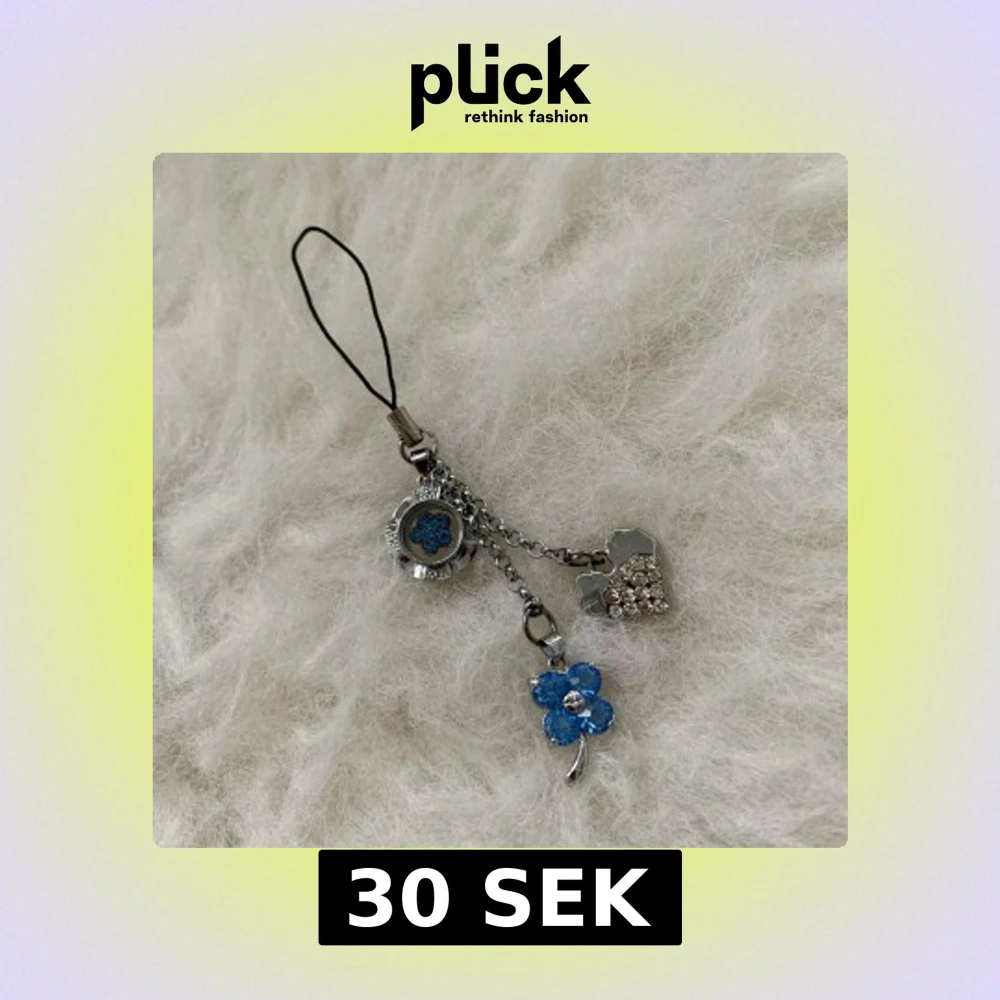 Charmigt mobilhänge i silverfärg med tre hängande berlocker: en blå blomma, ett hjärta med glittriga stenar och en rund berlock med blå blomdetalj. Perfekt för att ge din mobil en personlig touch.