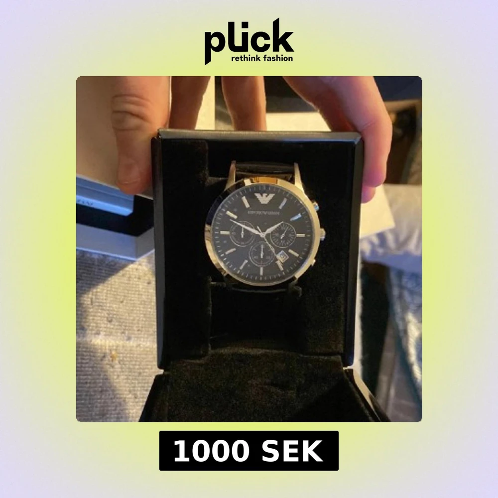 Stilren klocka från Emporio Armani med svart urtavla, silverfärgade detaljer och tre mindre urtavlor. Klockan har rund form och klassisk design, levereras i originalbox med logga. Perfekt accessoar för dig som gillar snygga detaljer. Den är i helt ny skick då den inte har använts. Hör av er