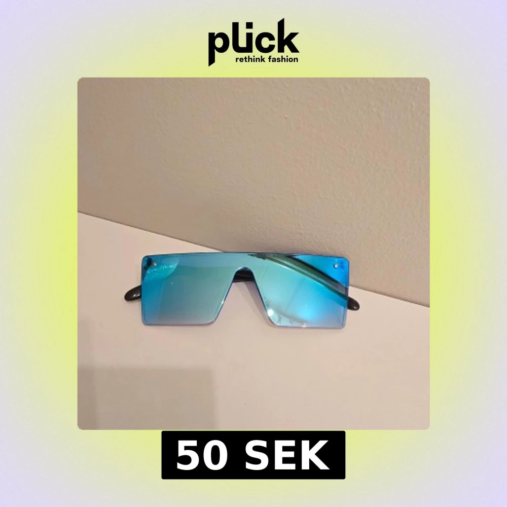 Säljer ett par futuristiska solglasögon med stora, rektangulära blå spegelglas och svarta skalmar. Glasögonen har en cool, kantig design som sticker ut och passar perfekt för dig som vill ha en unik stil.