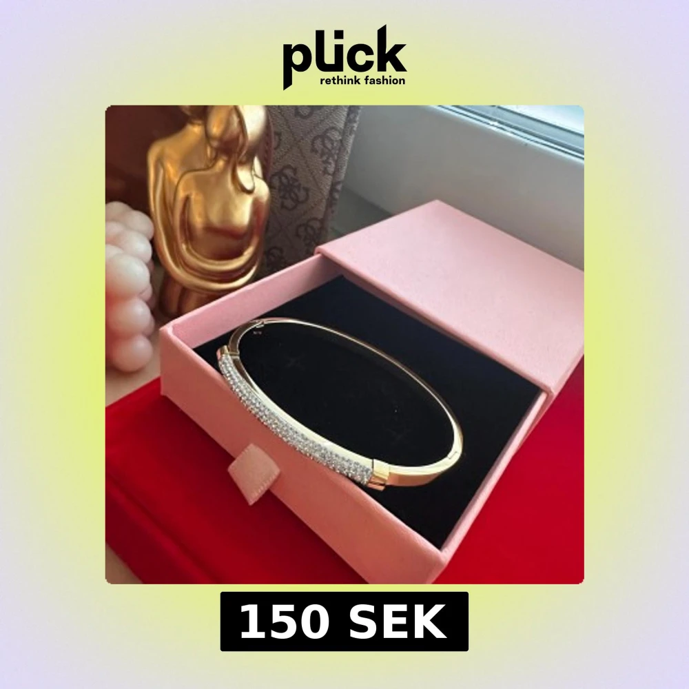Snyggt guldfärgat armband med en rak, stilren form och en rad glittrande stenar framtill. Perfekt accessoar för att lyfta din outfit med lite extra bling. Kommer i en söt rosa ask.