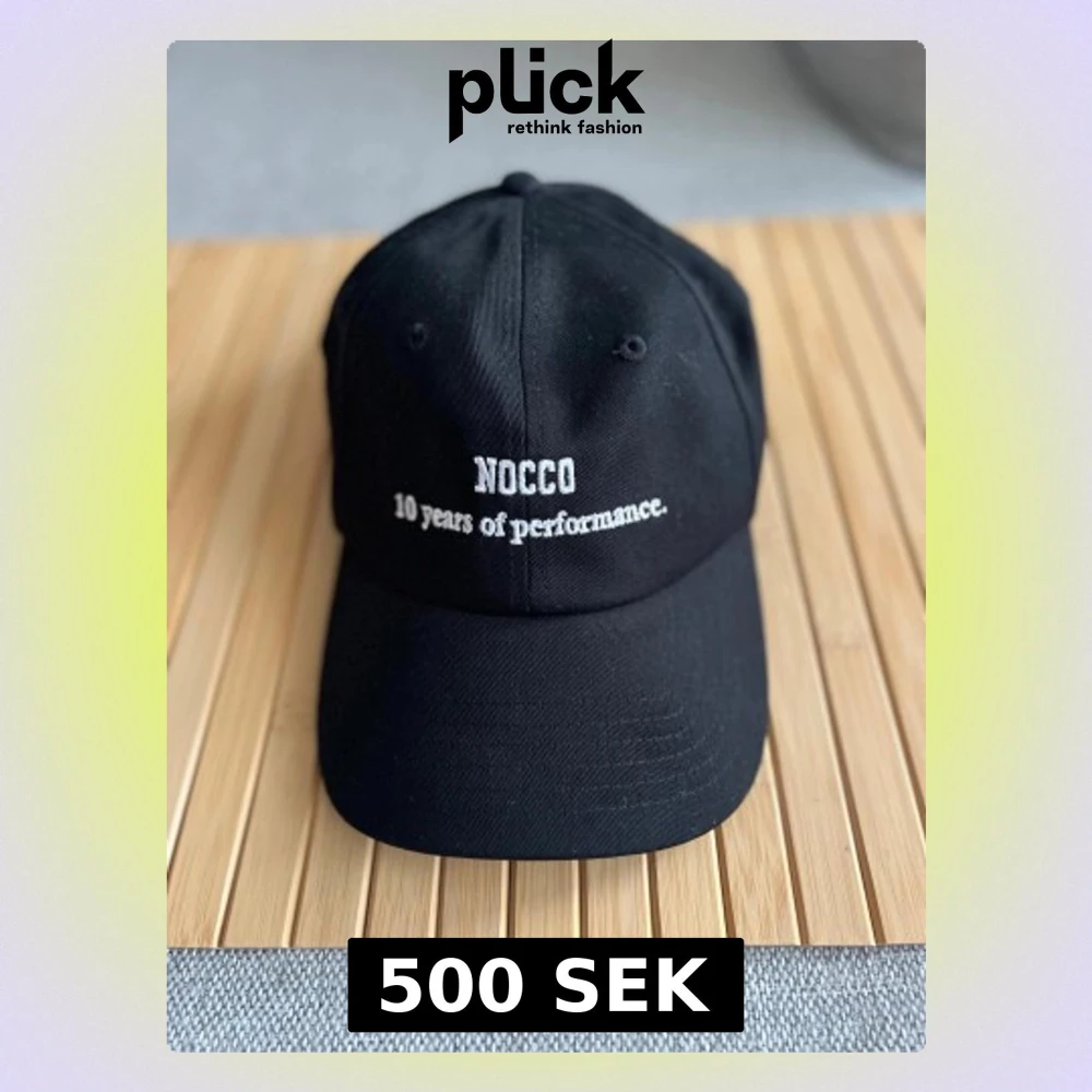 Svart keps från NOCCO med vit broderad text 'NOCCO 10 years of performance.' framtill. Klassisk böjd skärm och justerbar rem med metallspänne baktill. Tillverkad i slitstark bomull, perfekt för dig som gillar sportig och clean stil.