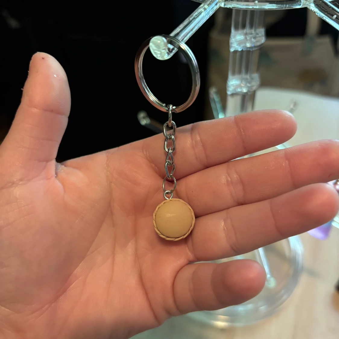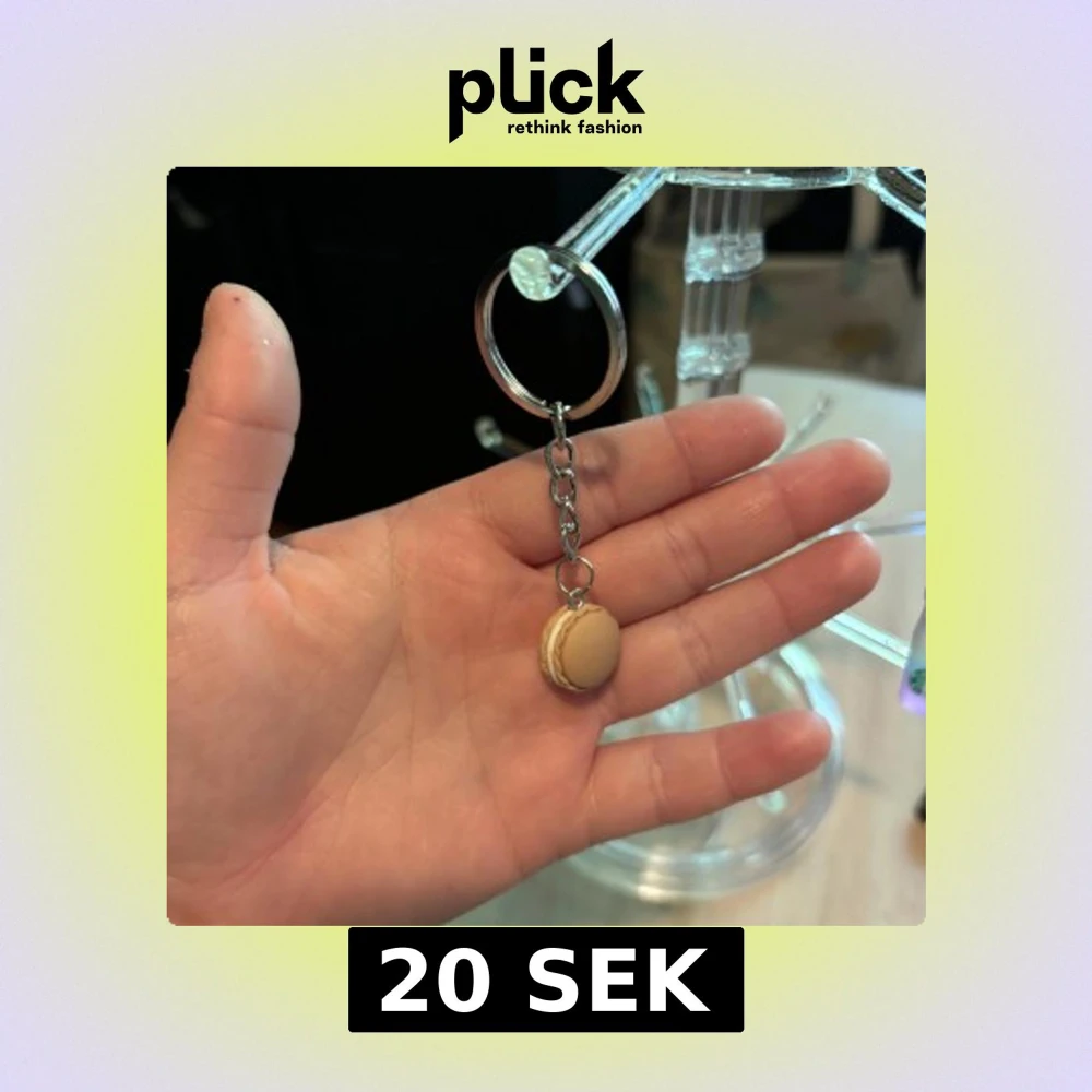 Söt nyckelring med en liten beige macaron-berlock i plast. Hängs på en silverfärgad metallkedja och ring. Perfekt accessoar för att piffa upp dina nycklar eller väska med en gullig och unik detalj.