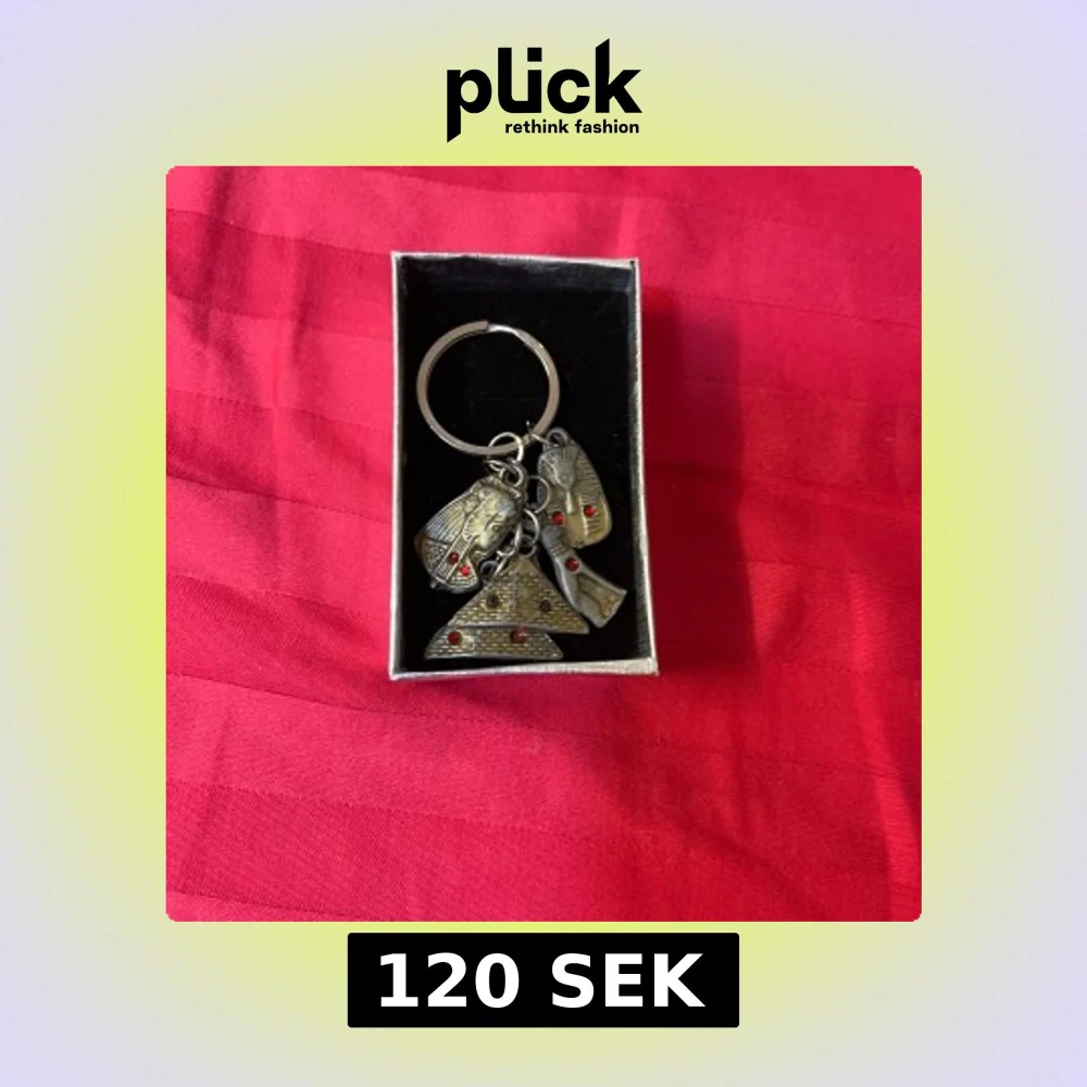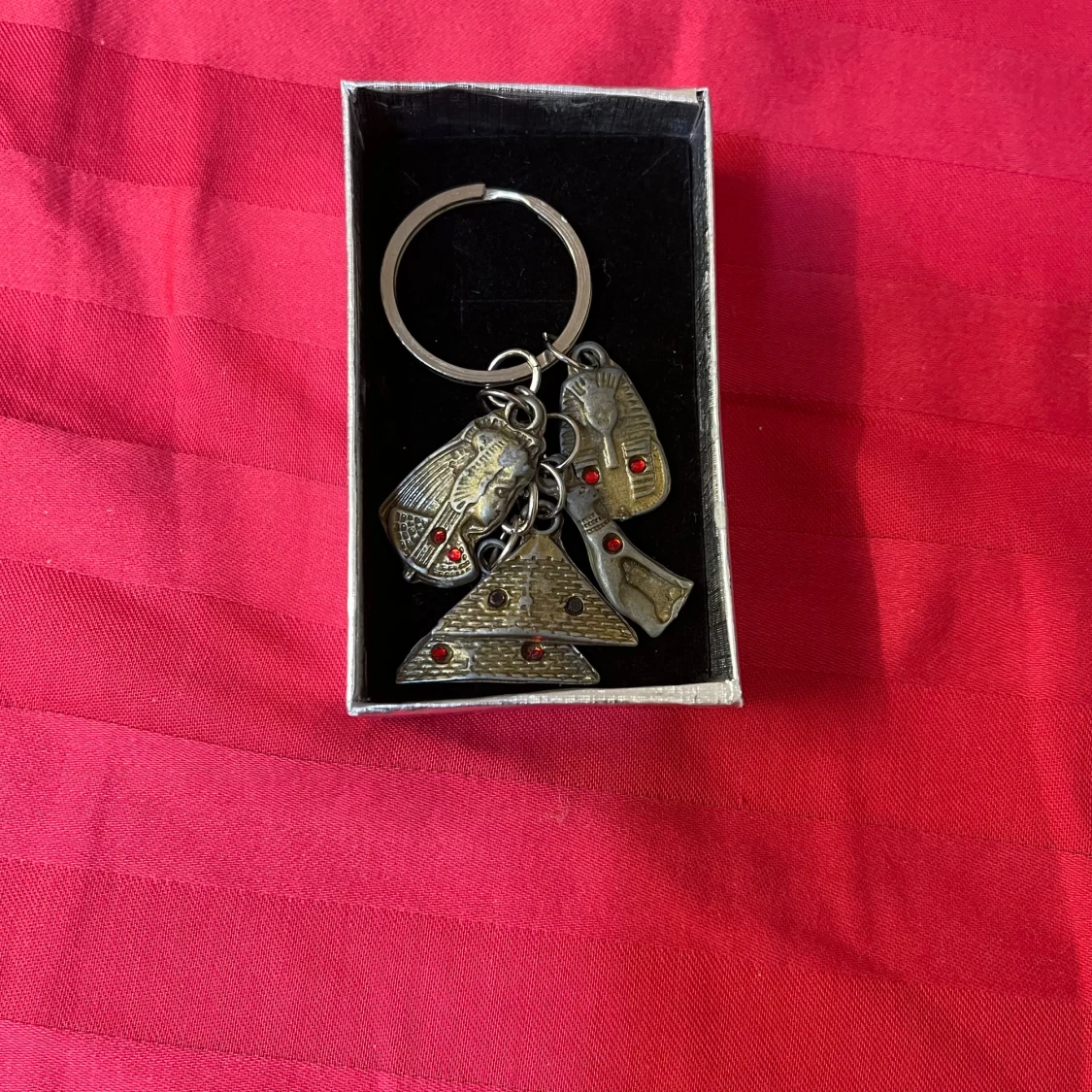 Cool nyckelring med antikguldiga berlocker i form av egyptiska motiv som farao och pyramid, dekorerade med små röda stenar. Kommer i en snygg silverfärgad presentask med rosett. Perfekt accessoar för dig som gillar unika detaljer.