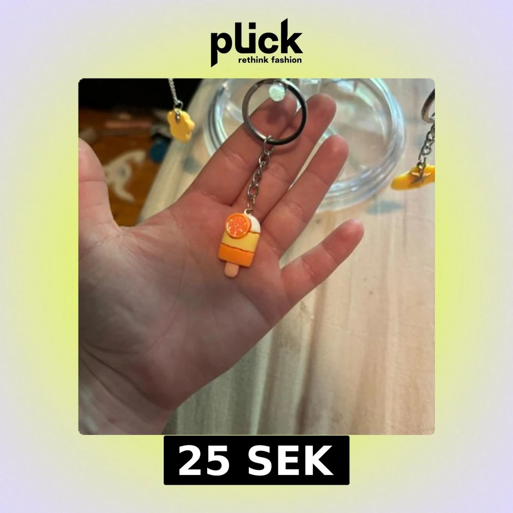 Söt nyckelring med en miniatyrglass i orange, vitt och gult. Glassen har en liten apelsinskiva på toppen och hänger i en silverfärgad kedja. Perfekt accessoar för att piffa upp dina nycklar eller väska.