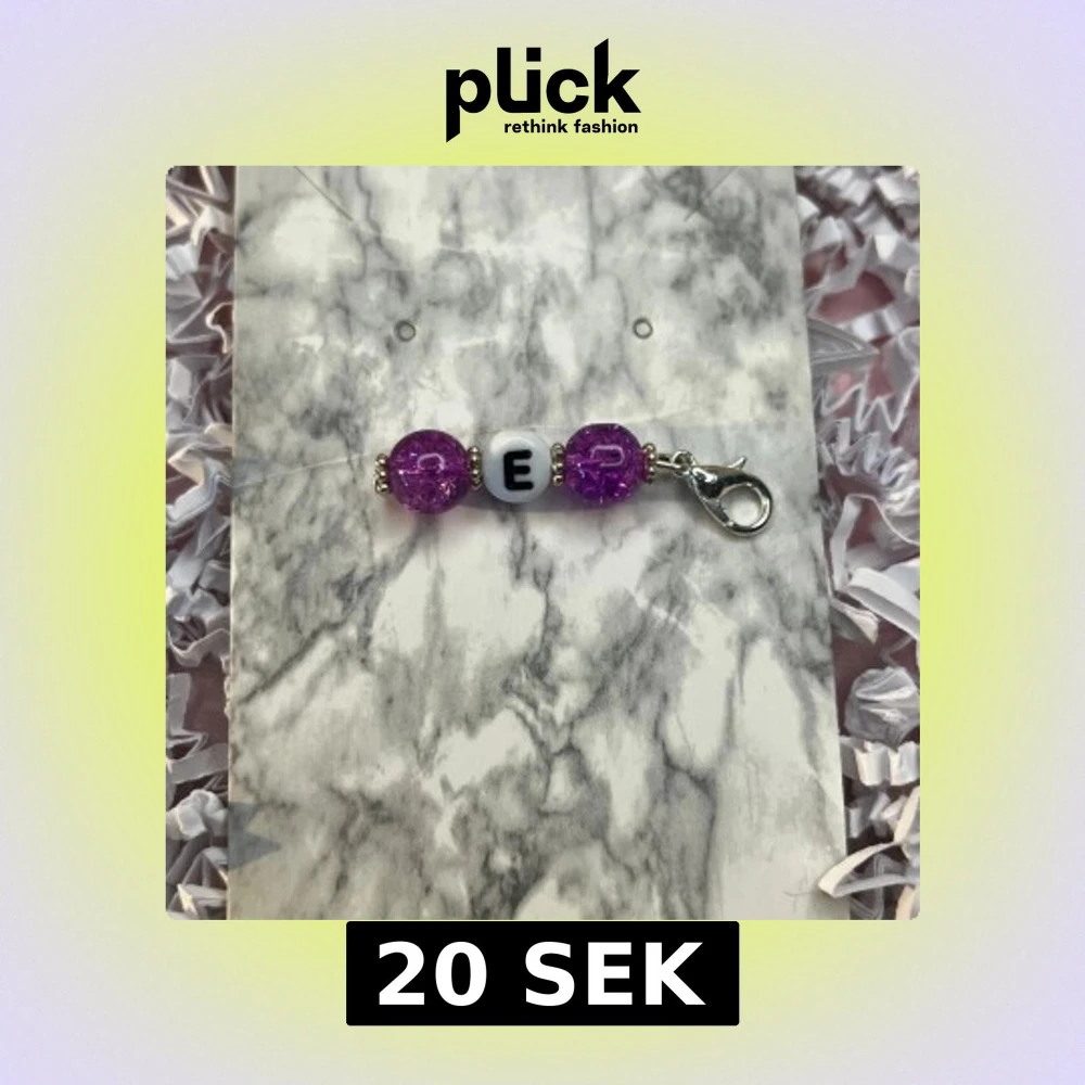 Charmig nyckelring med två glittriga lila pärlor och en vit pärla med bokstaven 'E'. Utrustad med en praktisk karbinhake för enkel fastsättning.