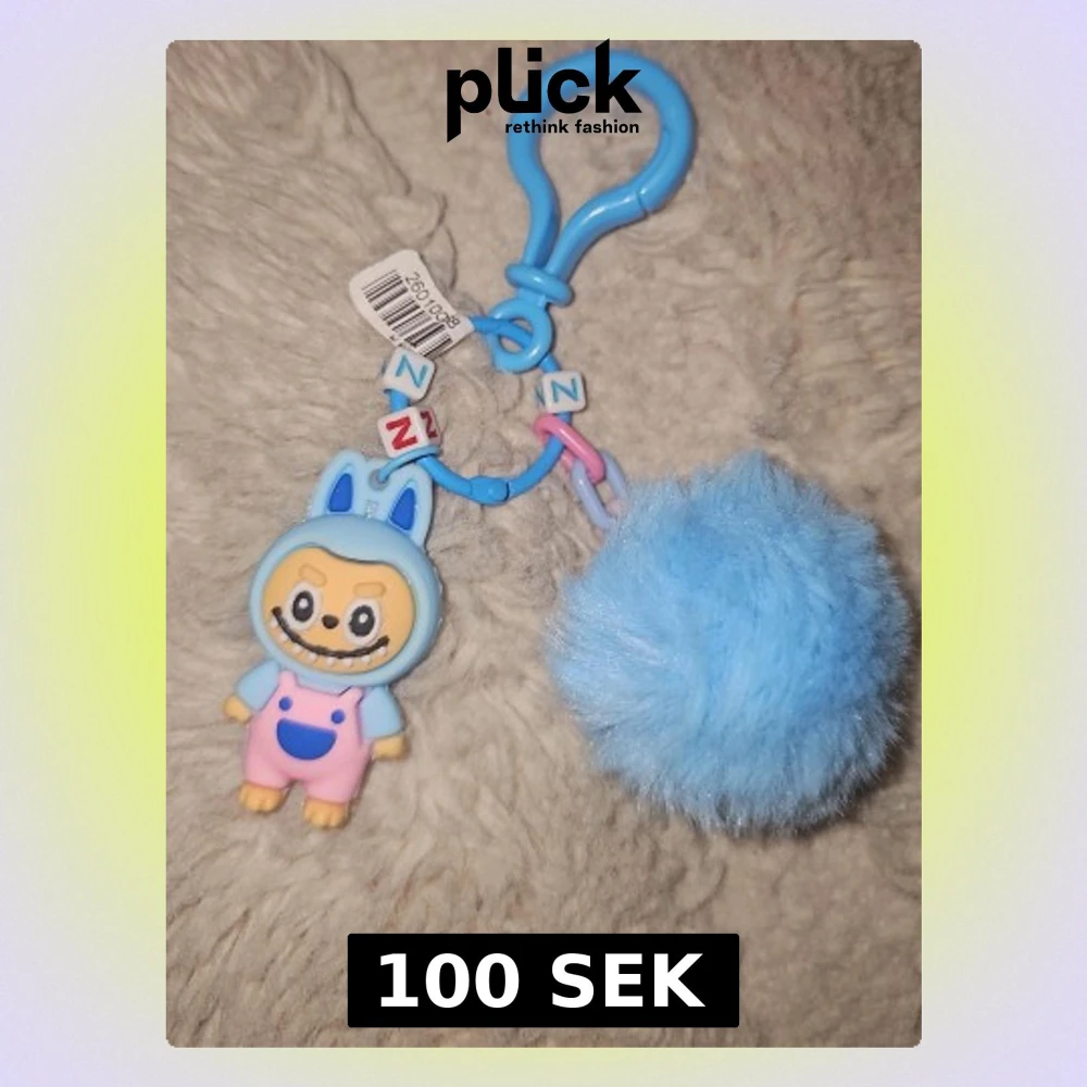 Söt nyckelring med en blå fluffig boll och en tecknad figur i blå och rosa overall. Nyckelringen har plastdetaljer i blått och pastellfärger samt bokstavspärlor. Perfekt att hänga på väskan eller nycklarna för en lekfull touch.