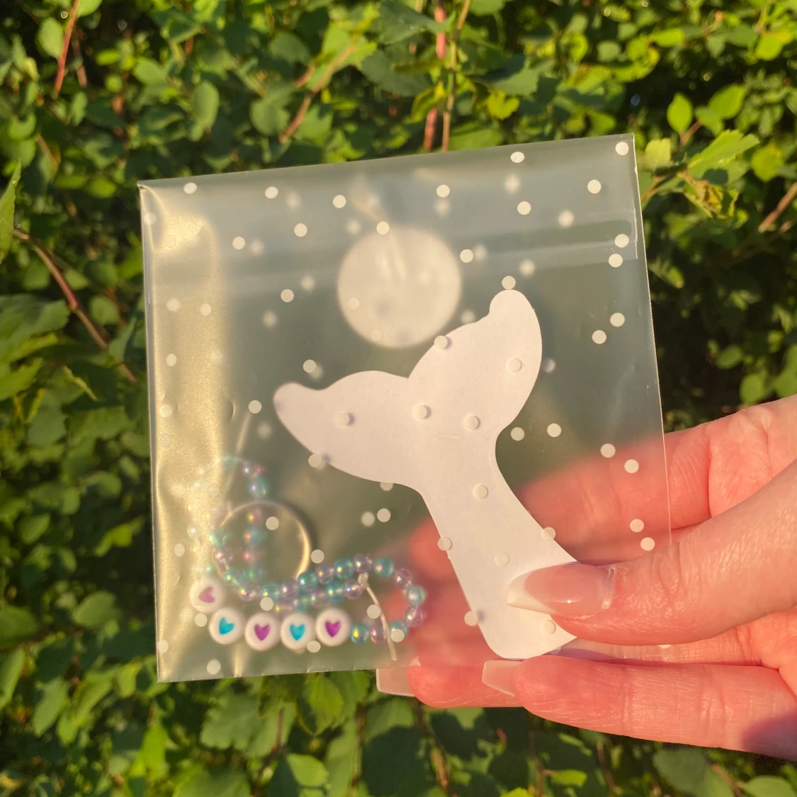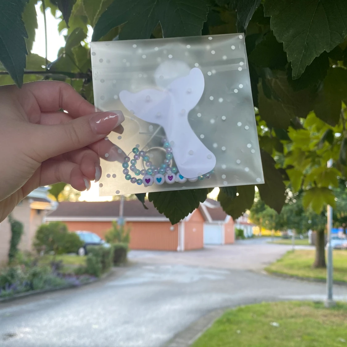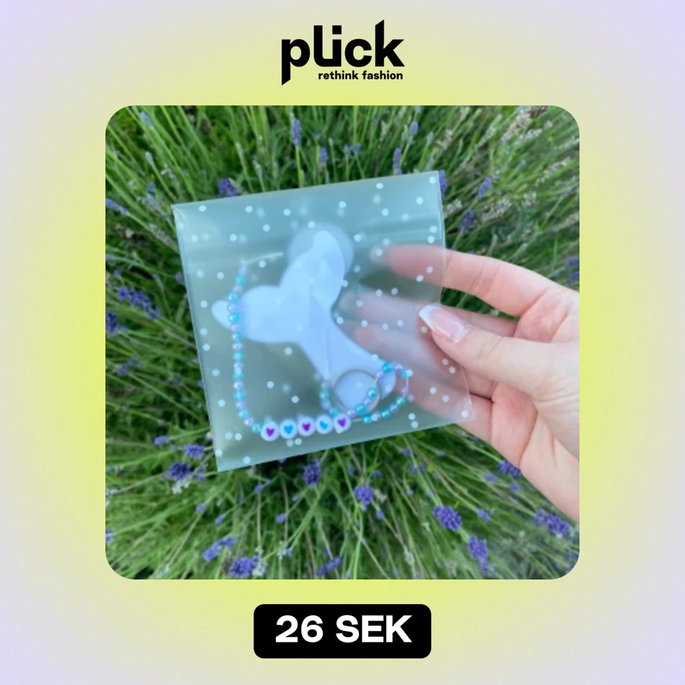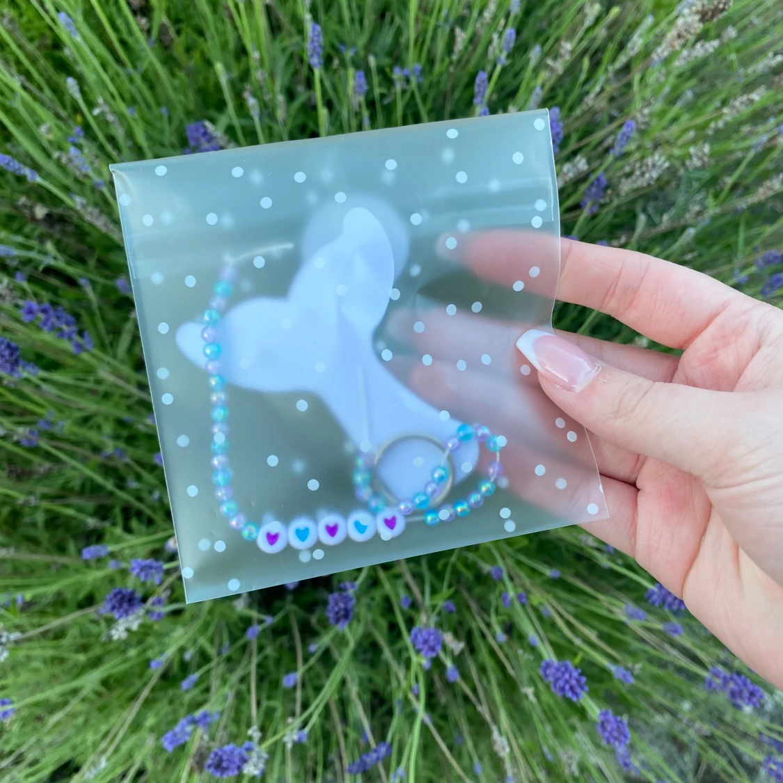 Vi säljer denna gulliga nyckelring. Den har små pärlor som är blåa och lila och även hjärtan i mitten.