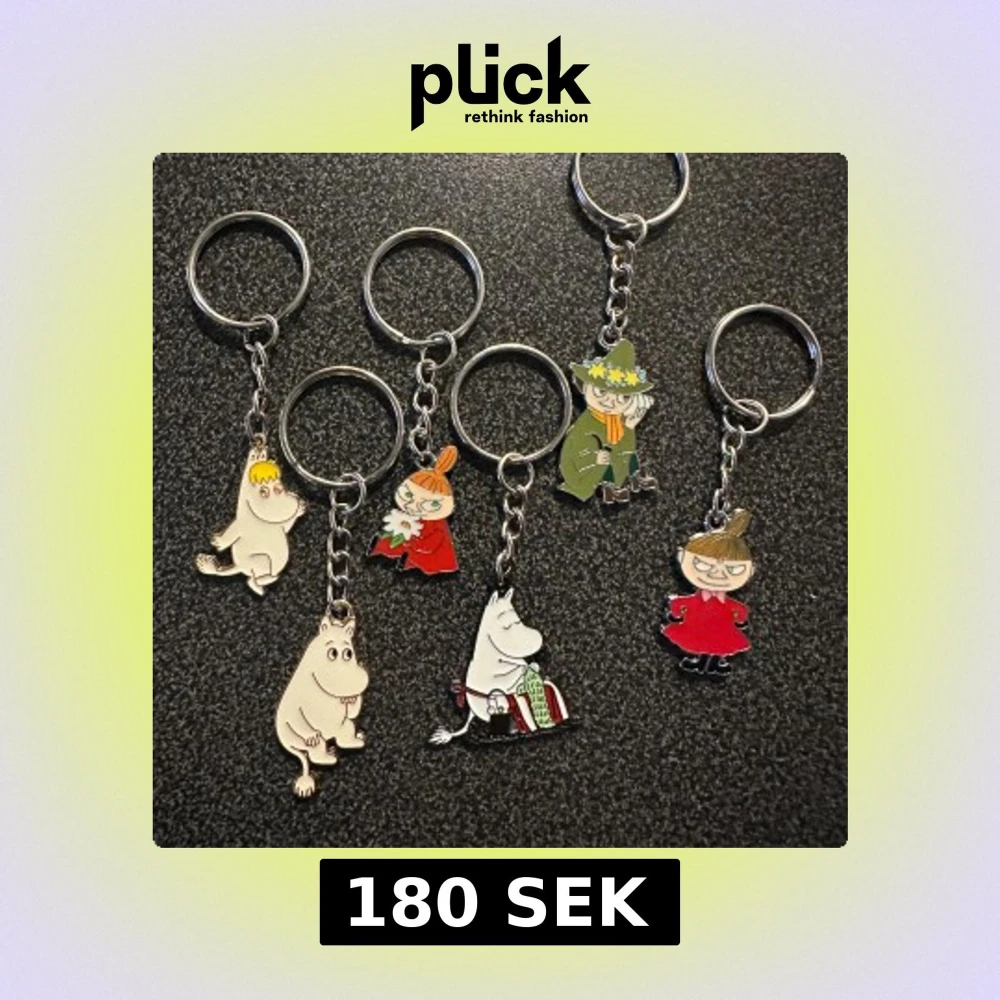 Säljer ett set med 6 nyckelringar med motiv från Mumindalen, inklusive Mumin, Snorkfröken, Lilla My och Snusmumriken. Figurerna är färgglada och tillverkade i metall med emaljerad yta. Perfekt för att ge din väska eller nycklar en personlig touch.