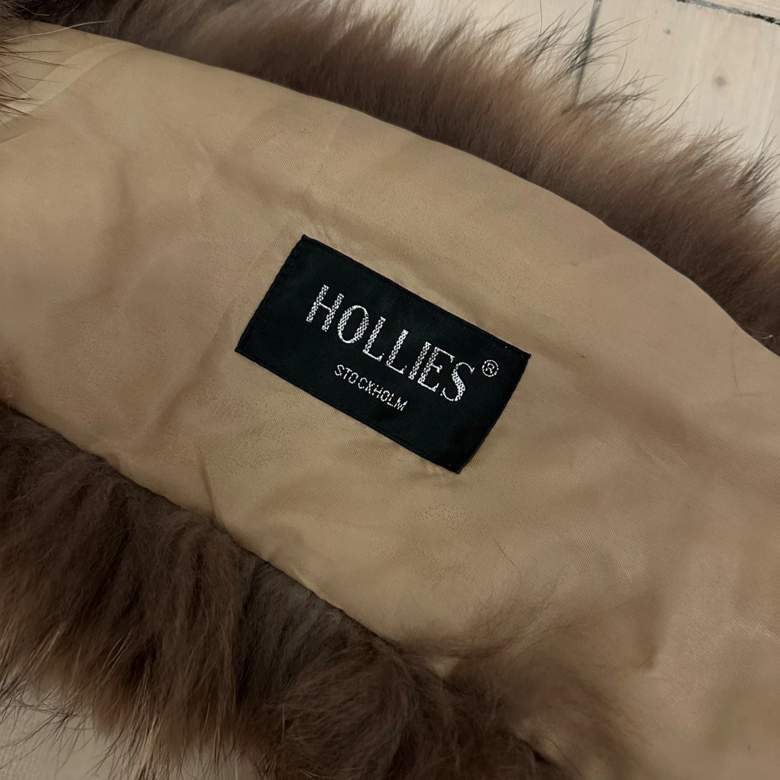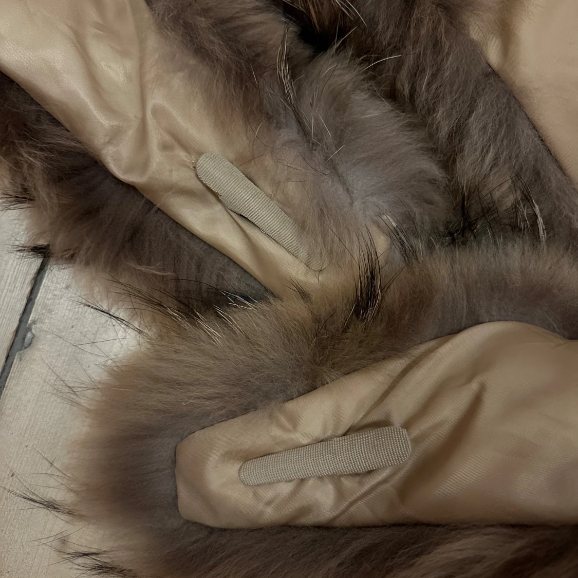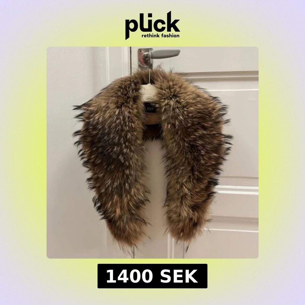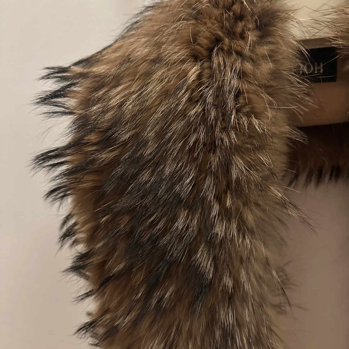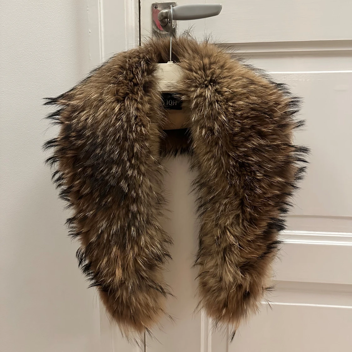 Stor pälskrage från tvättbjörn i toppskick, ca 100cm lång. Mycket fluffig och jämn i pälsen. Har två klämmor för att enkelt knäppa fast på t.ex jacka eller runt halsen som en halsduk.