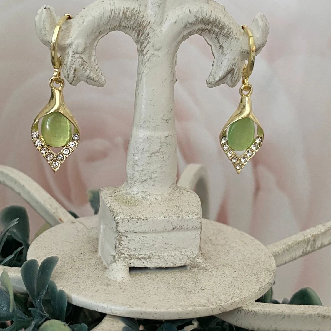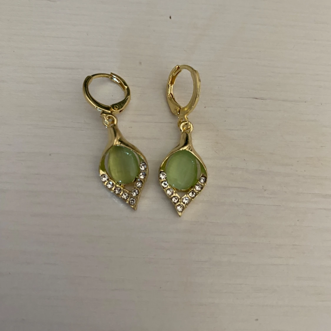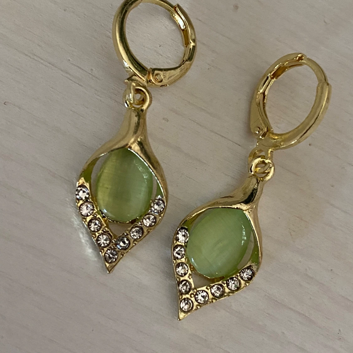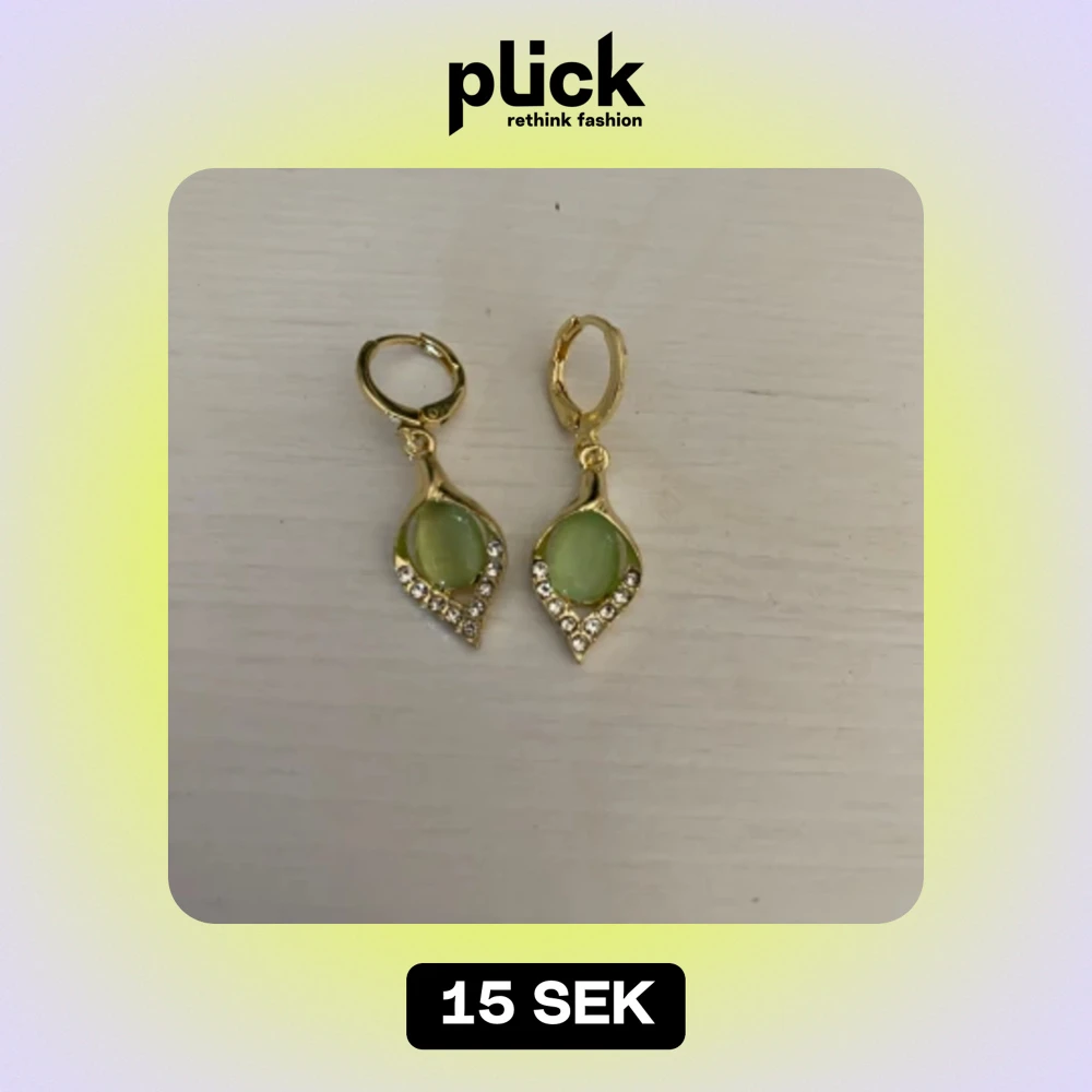Vackra vintage örhängen i guldfärgat rostfritt stål med jadegröna stenar. 3 cm långa, nya och okänt märke.