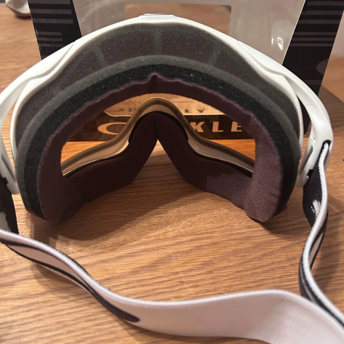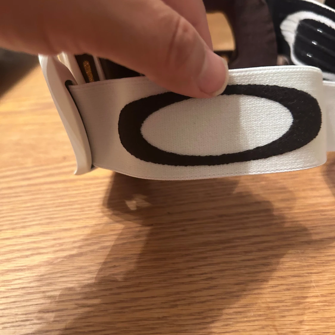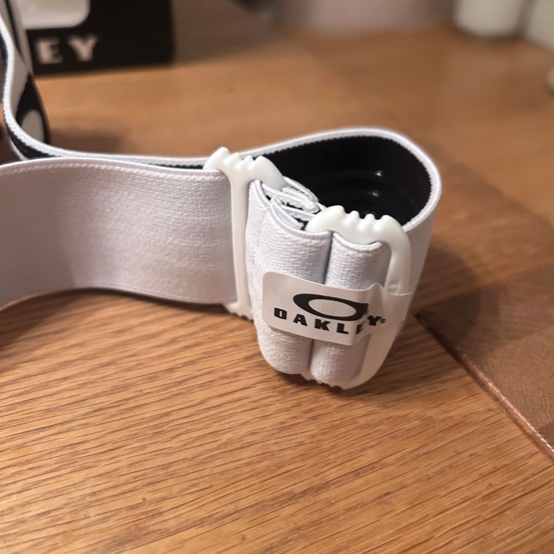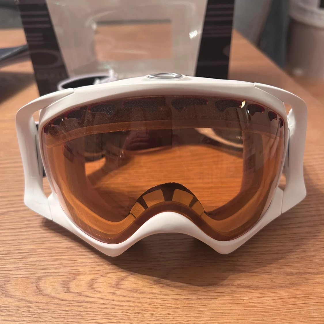 Säljer ett par feta Oakley skidglasögon med vit ram och bredt vitt band med svart Oakley-logga. Linsen är orange och ger grym kontrast i snön. Perfekta för dig som vill sticka ut i backen och få maxad sikt under åkning.