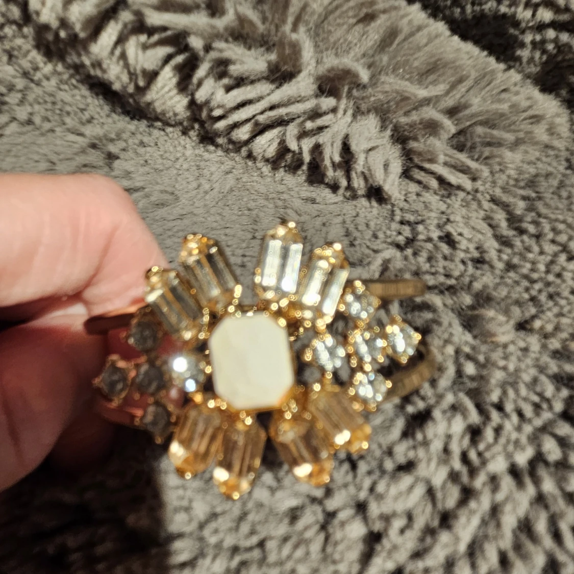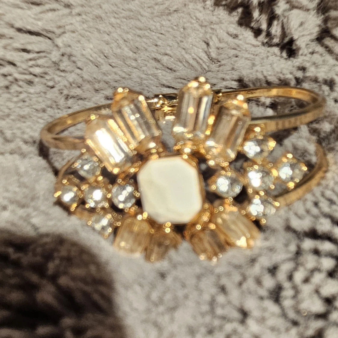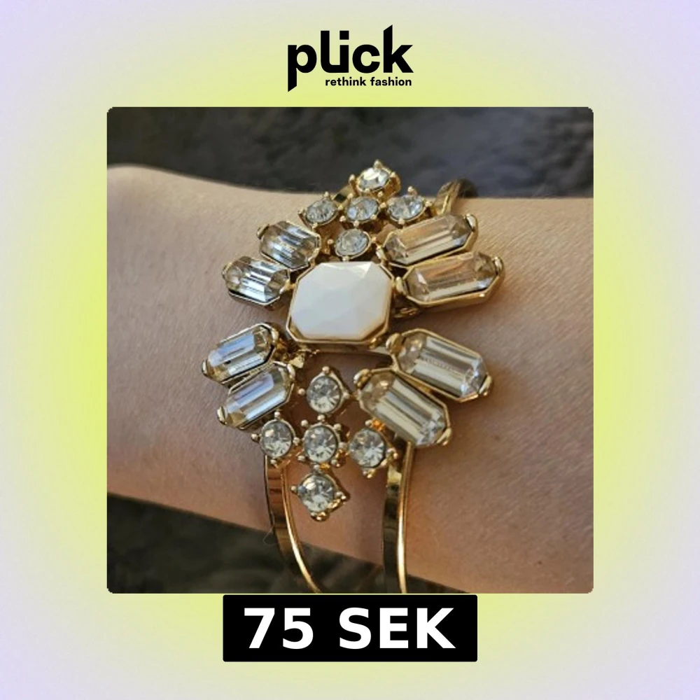 Öppningsbara oanvänt guldfärgat armband med blomma på . Köpt på ellos för många år sedan för 199 kr Mått tvärs över 6,3 cm