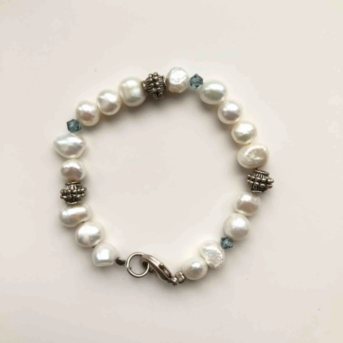 Superfint pärlarmband med äkta pärlor, metallpärlor och glaspärlor. Kan tyvärr inte använda det längre eftersom min handled inte är lika smal som förr.:(