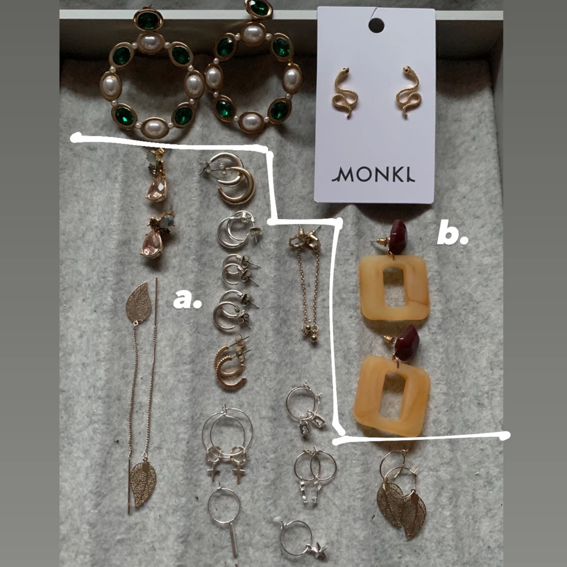 Har rensat ut och ska sälja några av mina örhängen då jag har alldeles för många!! Örhängena på första bilden kostar A. 20kr, B. 40kr, och resten av örhängena kostar 10kr✨✨ Skriv för mer bilder eller om ni har några frågor och funderingar☺️