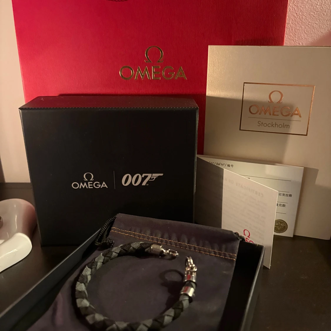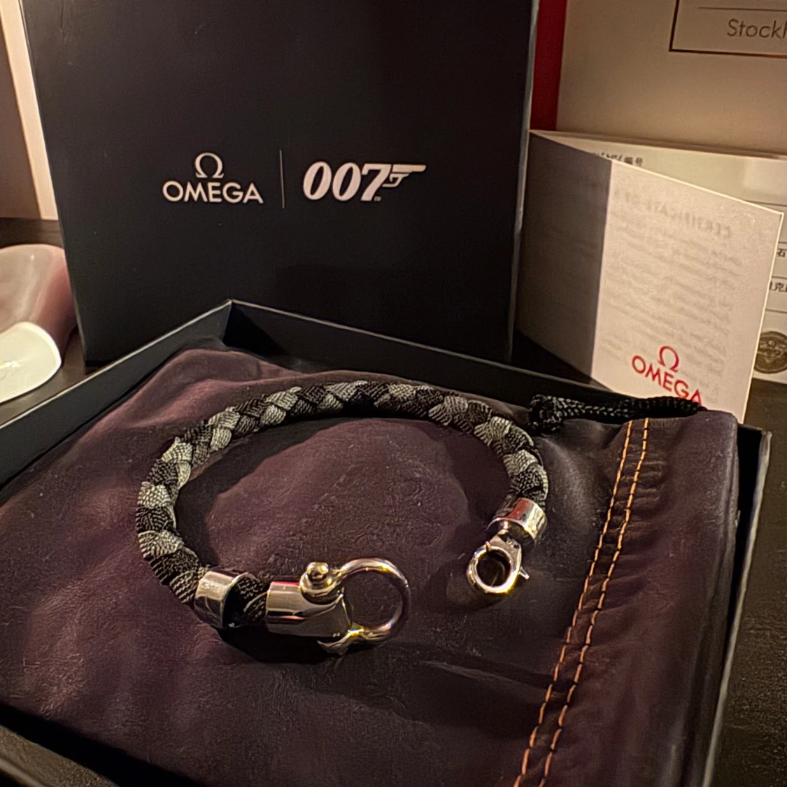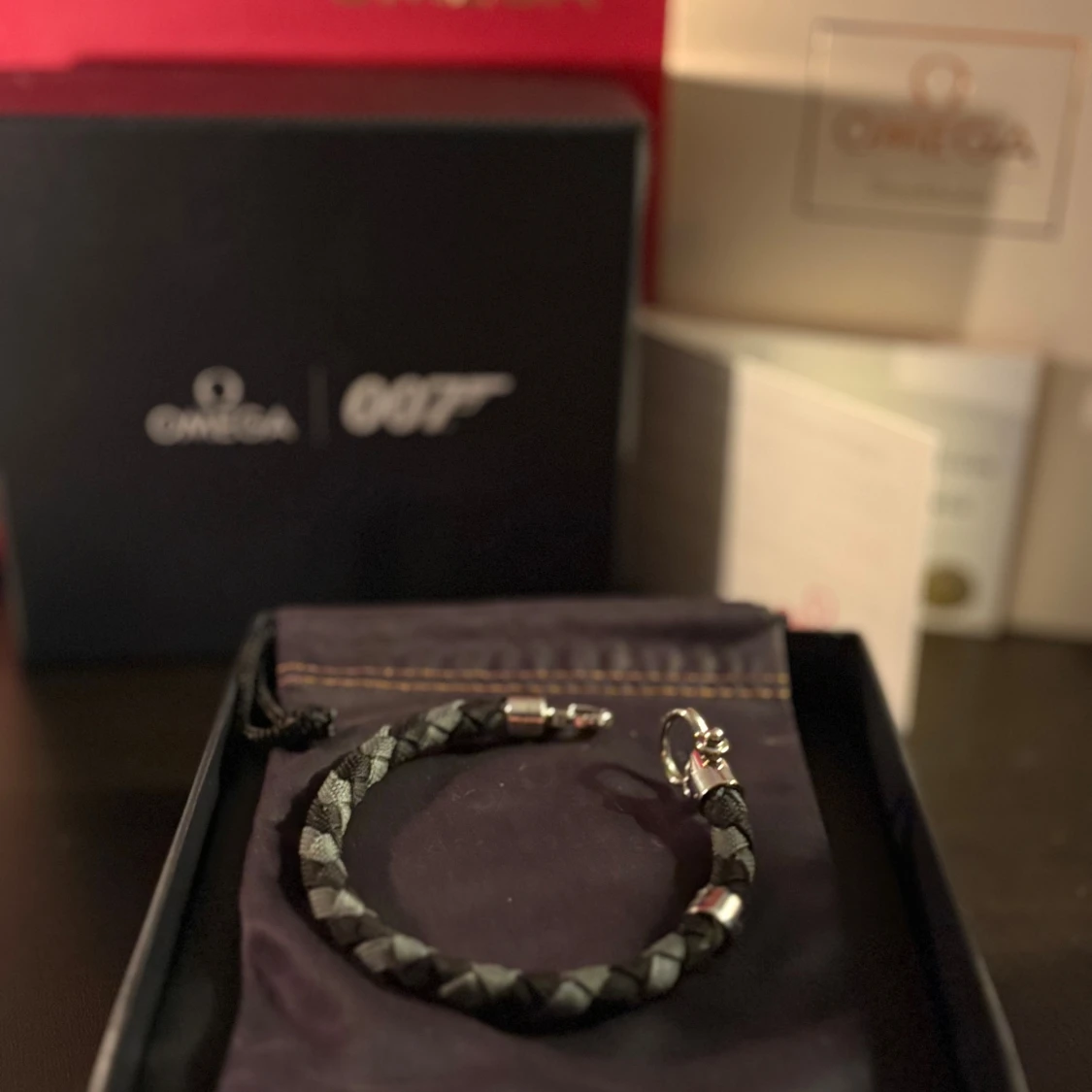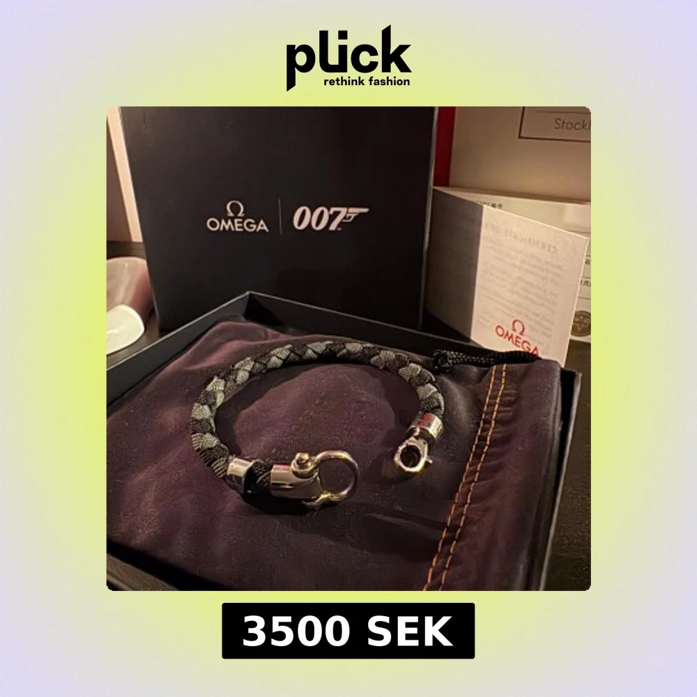 Exklusivt Omega 007 armband med flätad design i svart och grått. Snygga silverfärgade metalldetaljer och robust lås. Kommer i originalförpackning med Omega och 007-logga, perfekt för dig som gillar James Bond och stilrena accessoarer.