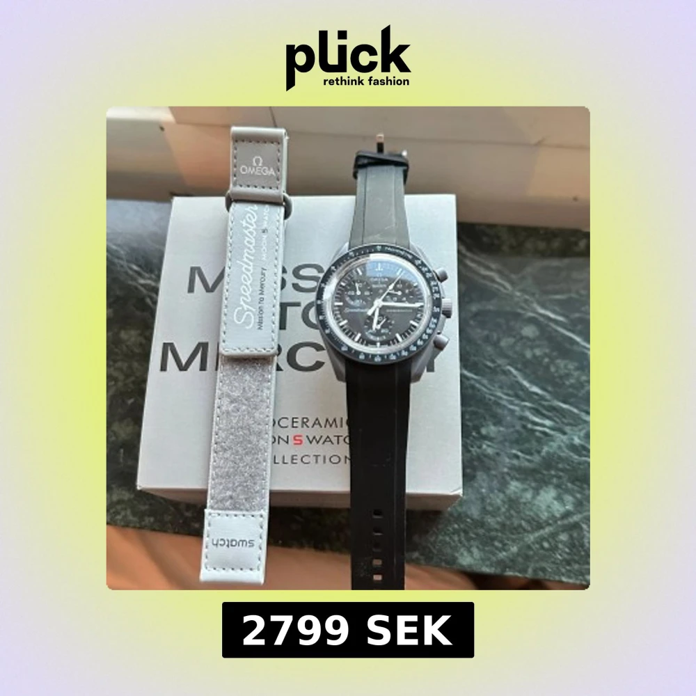 Säljer en Omega x Swatch Speedmaster med svart urtavla och svart armband. Klockan har en klassisk design med tydliga markeringar och en stilren look. Perfekt för den som gillar tidlös elegans.