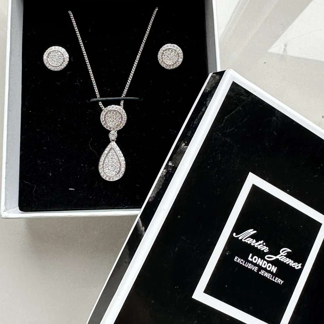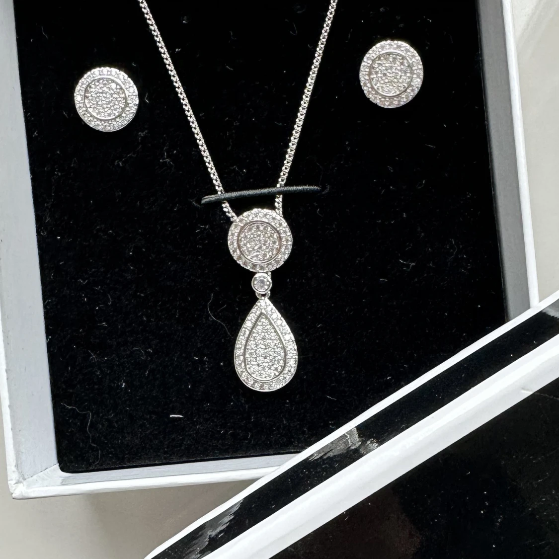 Matchande örhängen och halsband i silver med glittrande detaljer, oanvänt! Perfekt att ge bort i present🤍