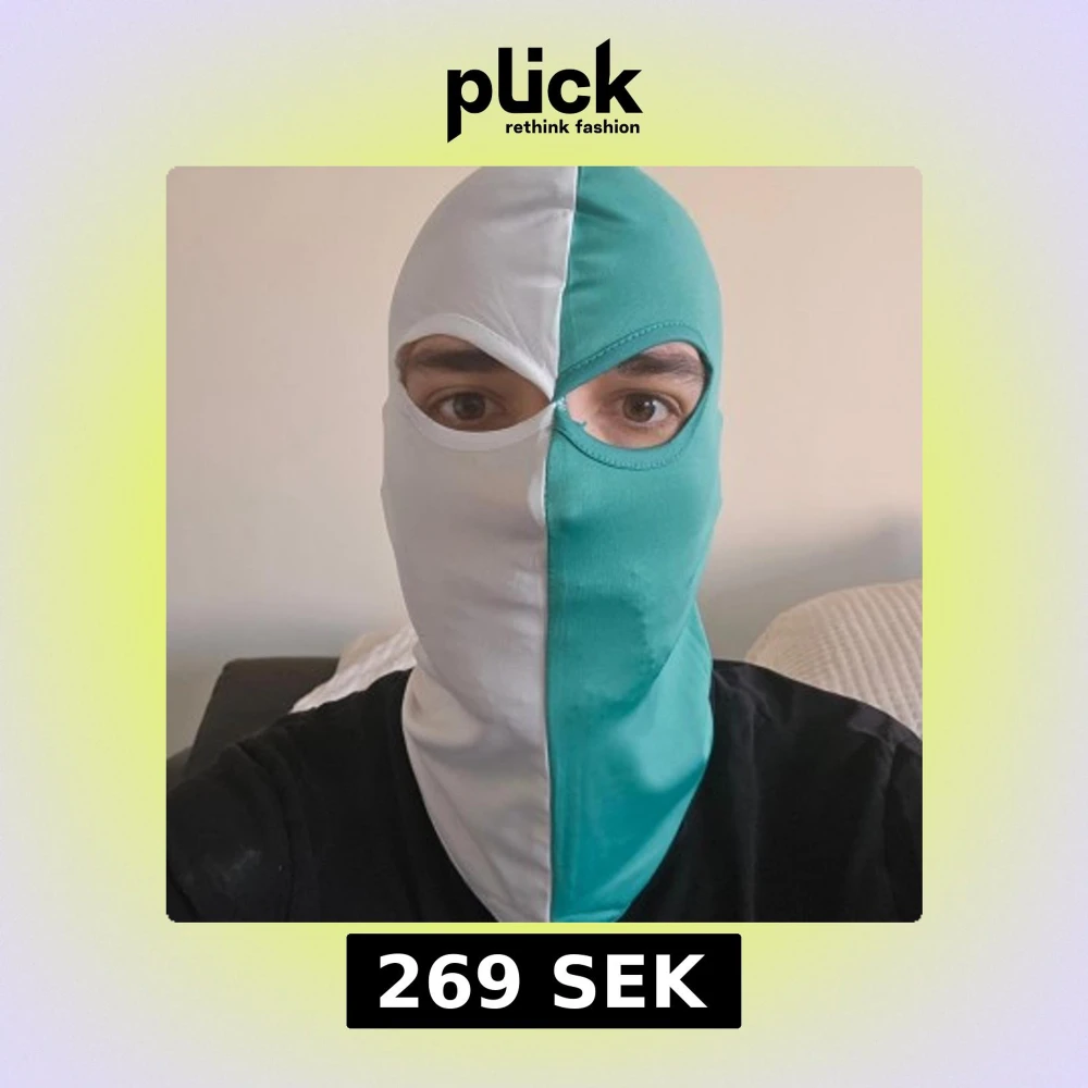 Säljer balaclava i turkos och vit färg, med två hål för ögonen. Finns i helfärgad turkos, helfärgad vit och en tvådelad variant med halva i turkos och halva i vitt. Tillverkad i mjuk och stretchig polyester som sitter skönt runt huvudet.