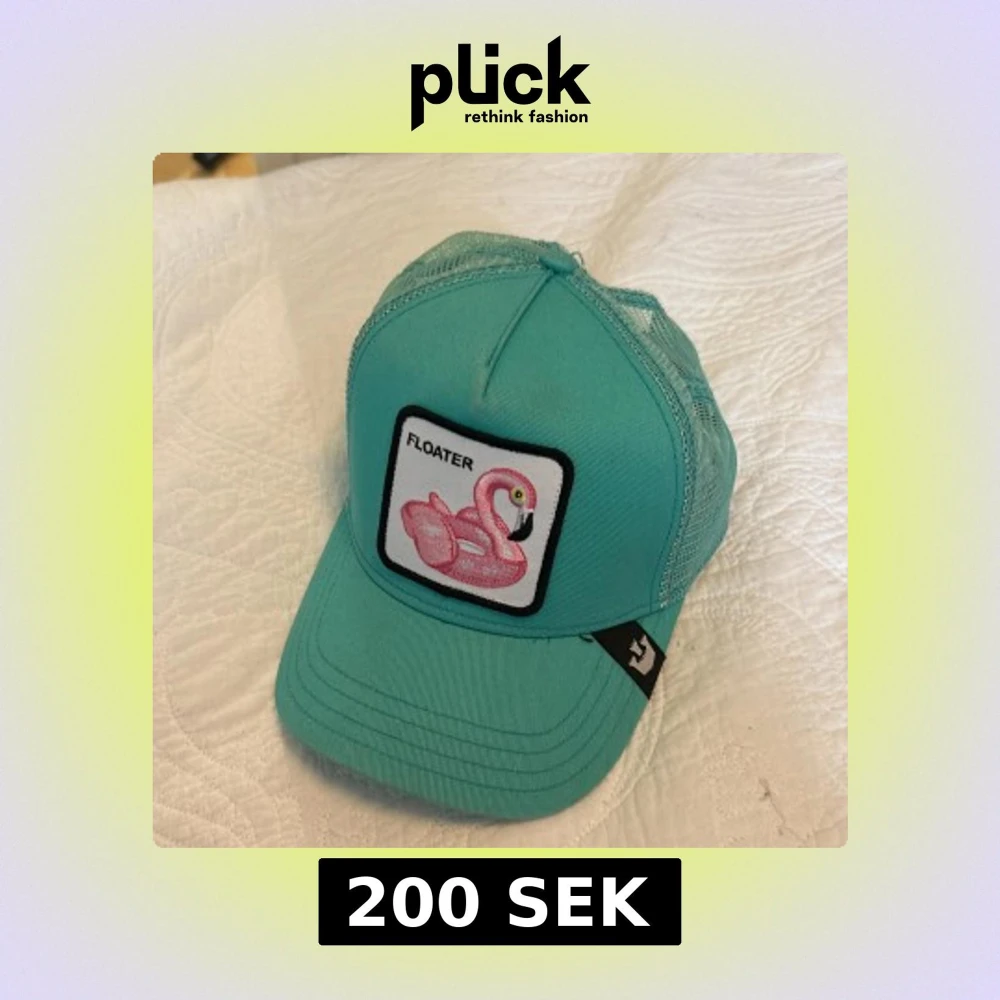 Säljer en turkos keps med mesh-bakstycke och patch framtill med en rosa flamingo och texten 'FLOATER'. Justerbar baktill och märkt med The Farm på insidan.