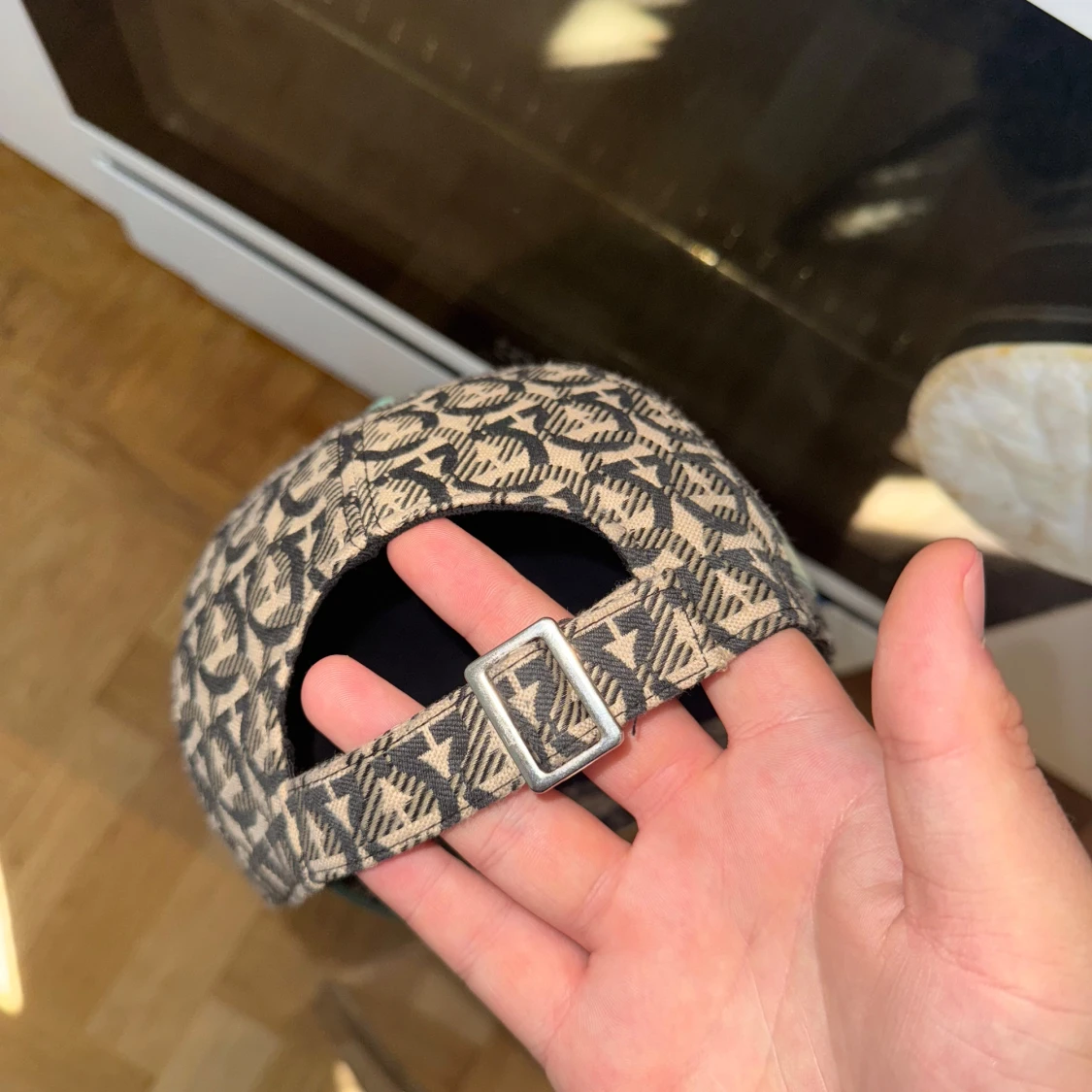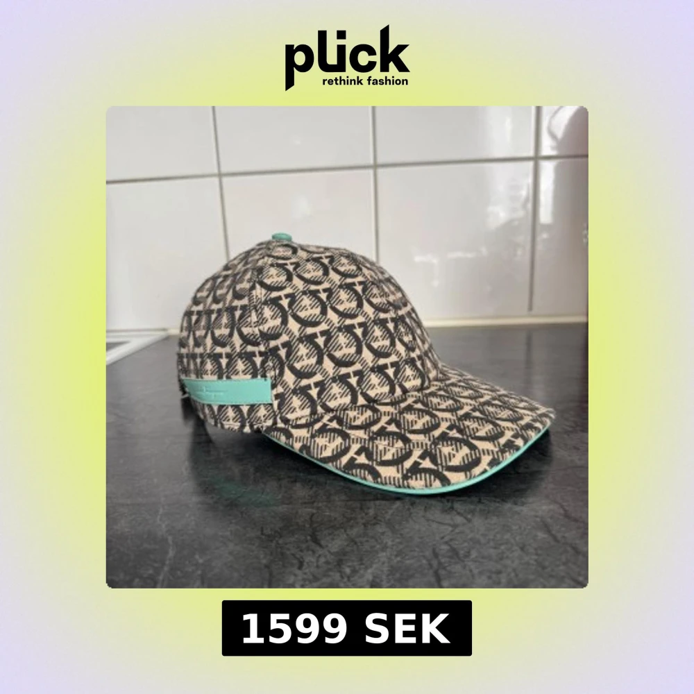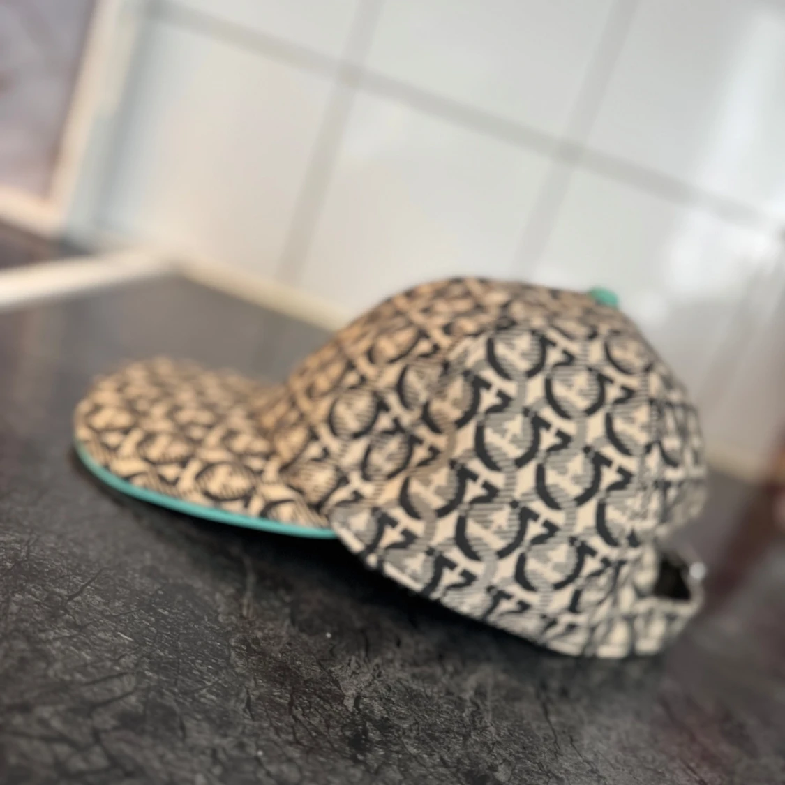 Snygg keps från Salvatore Ferragamo med beige och svart grafiskt mönster över hela kepsen. Justerbar rem med metallspänne och en mintgrön detalj baktill samt under skärmen. Perfekt för dig som vill sticka ut med en unik accessoar.