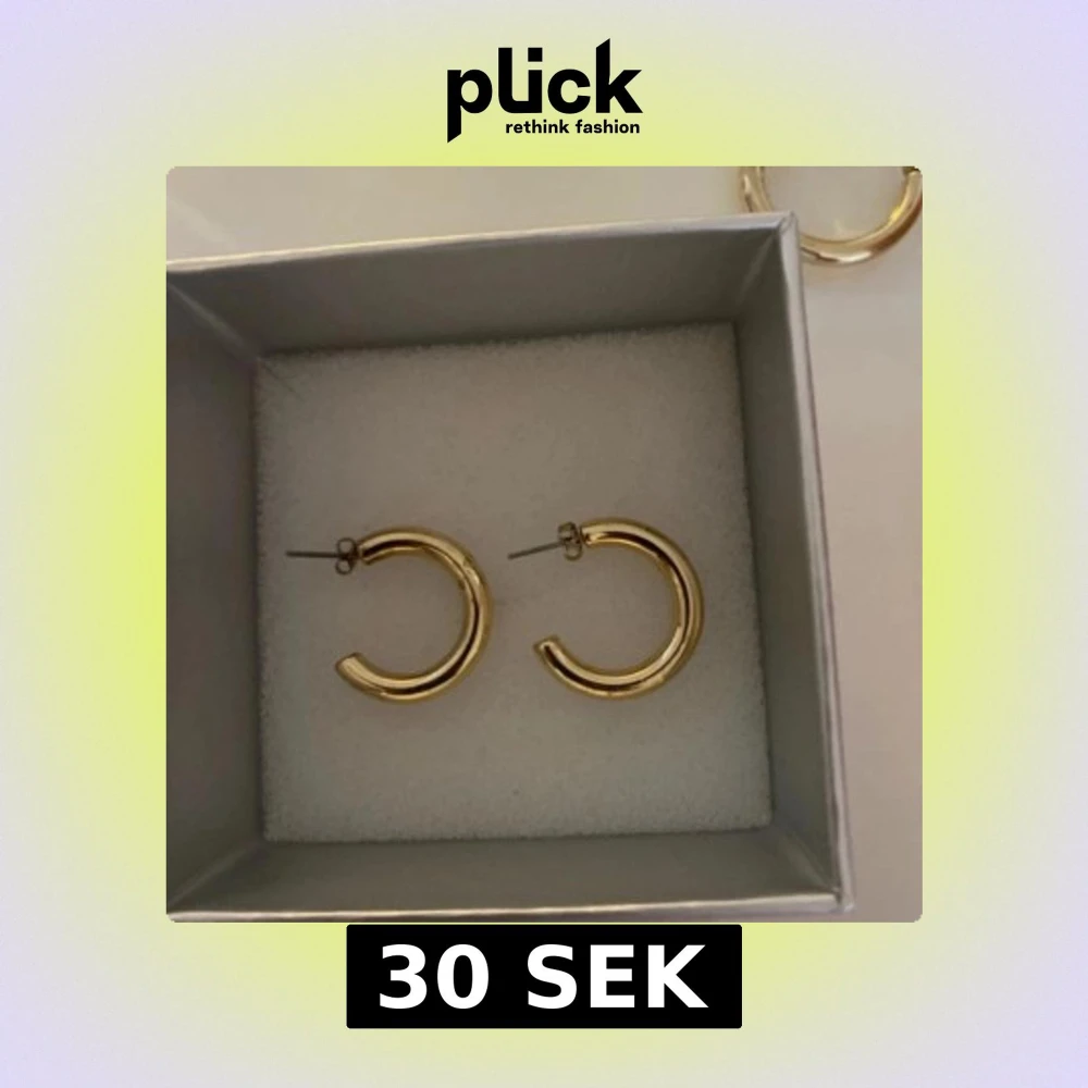 Säljer ett par oanvända chunky hoops i guldig färg. De är runda och har en stilren, minimalistisk design som passar perfekt till dig som gillar statement-smycken. Örhängena är i metall och har klassisk stiftbaksida.