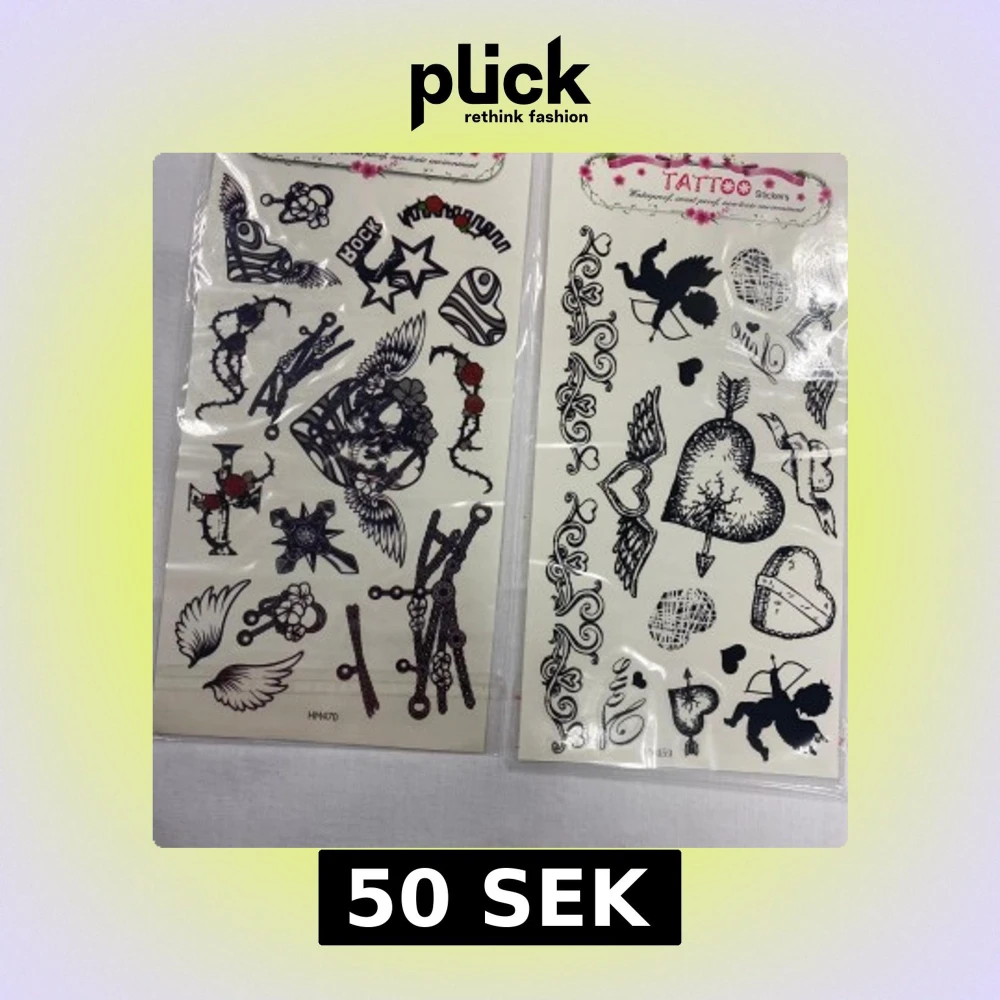 Säljer ett set med tatueringsklistermärken i olika mönster och stilar. Innehåller motiv som stjärnor, hjärtan, tribal, fjädrar och text. Perfekt för att skapa en unik look utan permanenta tatueringar. 50kr/2st/bild , samma frakt