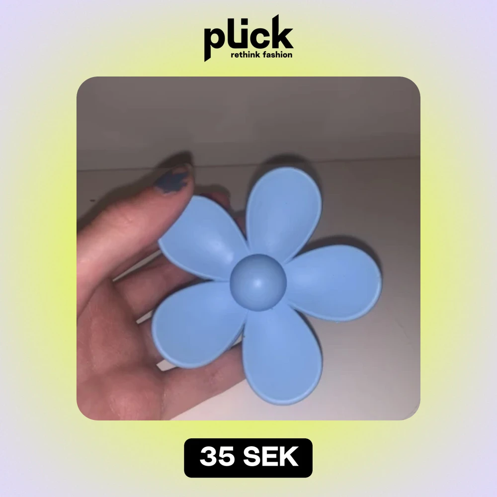 Säljer en superfin blå hårklämma som ser ut som en blomma. Den har sex kronblad och är perfekt för att hålla håret på plats på ett stiligt sätt. Klämman är gjord av plast och är både söt och praktisk. Perfekt accessoar för att piffa upp din frisyr!