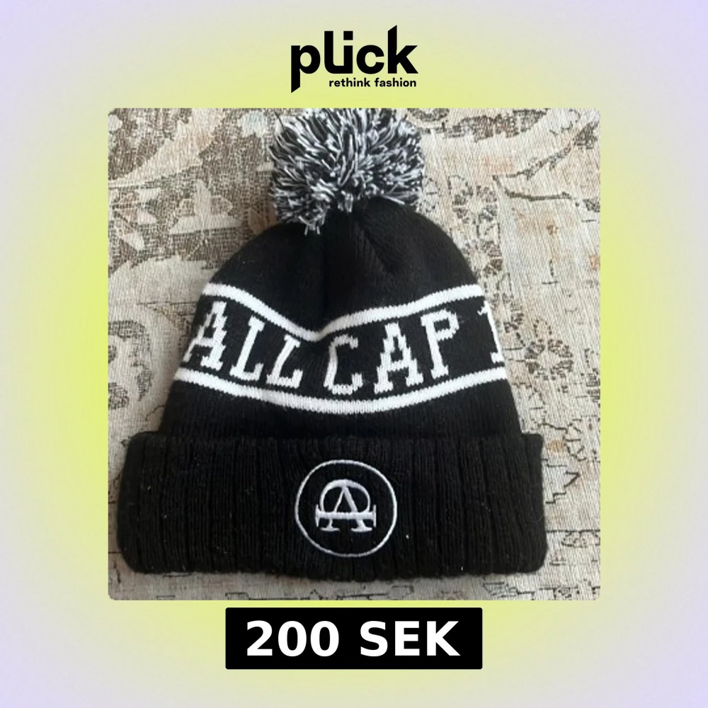 Svart stickad mössa med vit text 'ALL CAP 1' och broderad logga framtill. Mössan har en stor svartvit tofs på toppen och vita ränder runt om. Perfekt för kalla dagar och snygg streetstil.