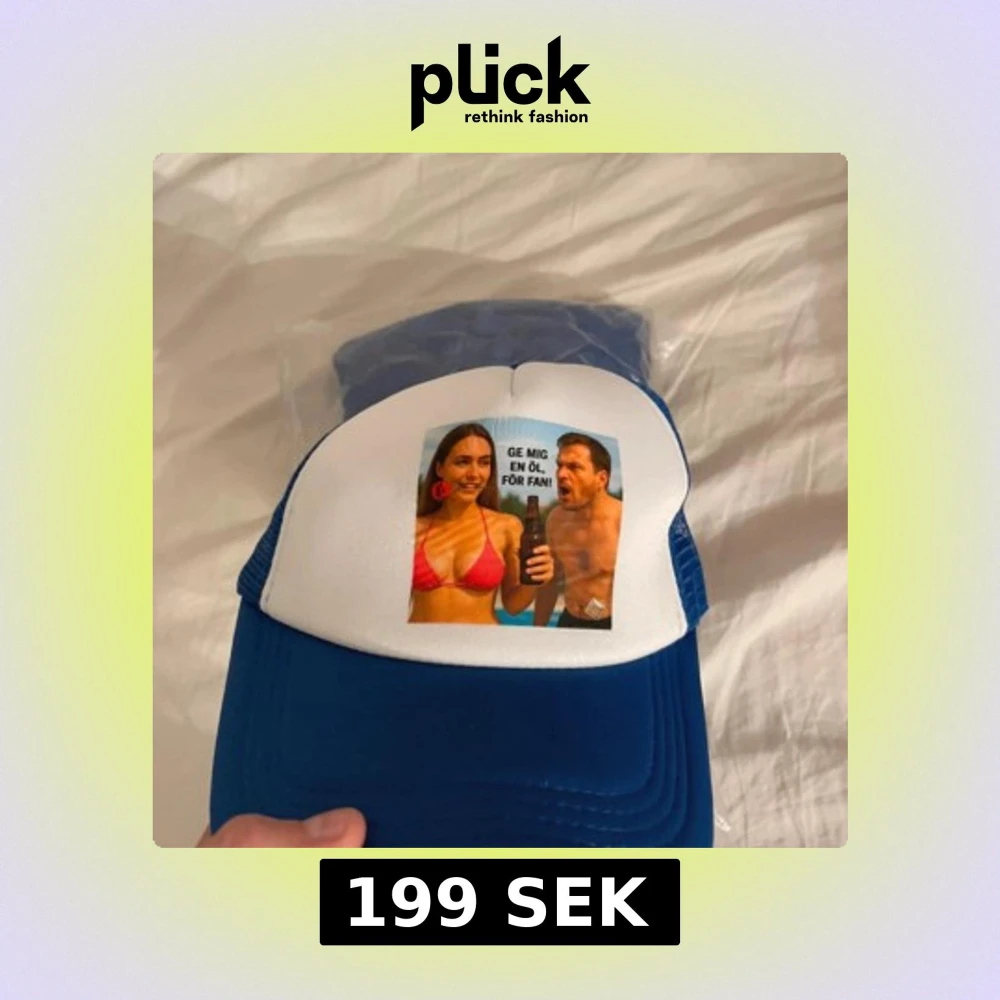 Säljer en blå och vit truckerkeps med mesh-bak och justerbar snapback. Framsidan har ett färgglatt tryck med texten 'GE MIG EN ÖL, FÖR FAN!' och motiv av två personer vid en pool. Perfekt för sommarens alla sköna dagar.