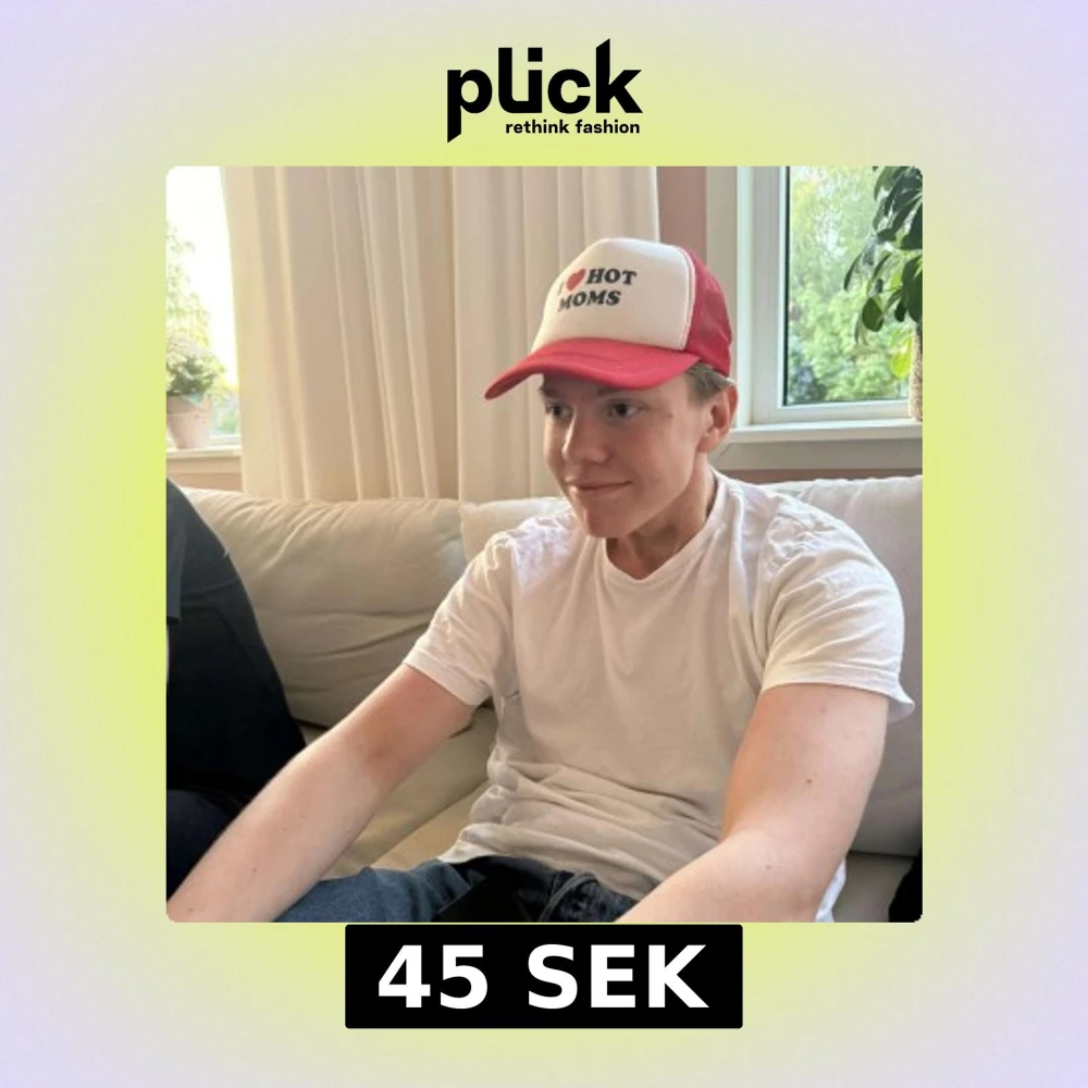Säljer en vit och röd keps med texten 'I ❤️ HOT MOMS' framtill.