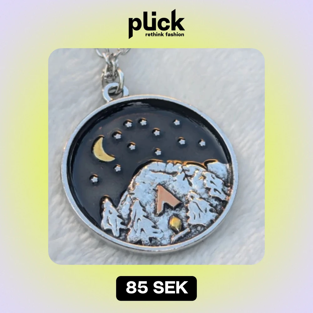 halsband med ett runt hänge som visar ett nattligt landskap. Hänget har en svart bakgrund med en gul måne och stjärnor. Det finns också ett berglandskap med snötäckta träd och ett tält i mitten. Kedjan är i silverfärgat Metall.