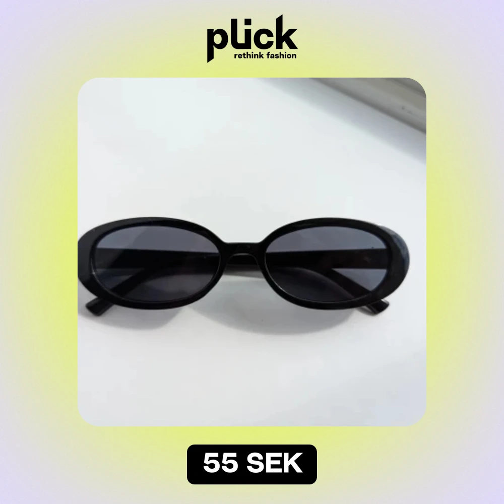 Ett par svarta ovala solglasögon med mörka linser. Glasögonen har en enkel och stilren design med en svart ram och svarta skalmar.