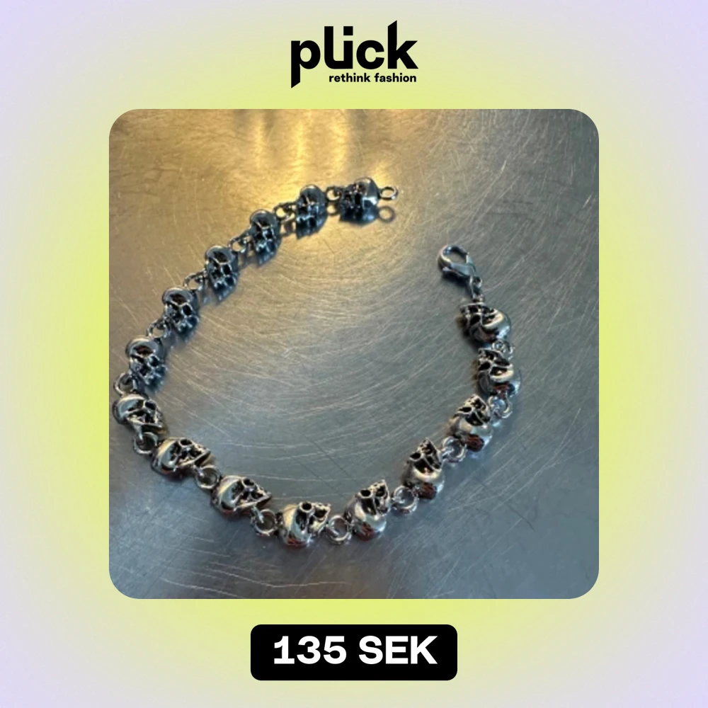 Skitcleant armband i legerat stål. Ca 20-22 cm långt. Jag tog bort 2 dödskallar med tång för att den skulle passa mig. Jättenkelt o ta bort. Feta dödskallar riktigt nice