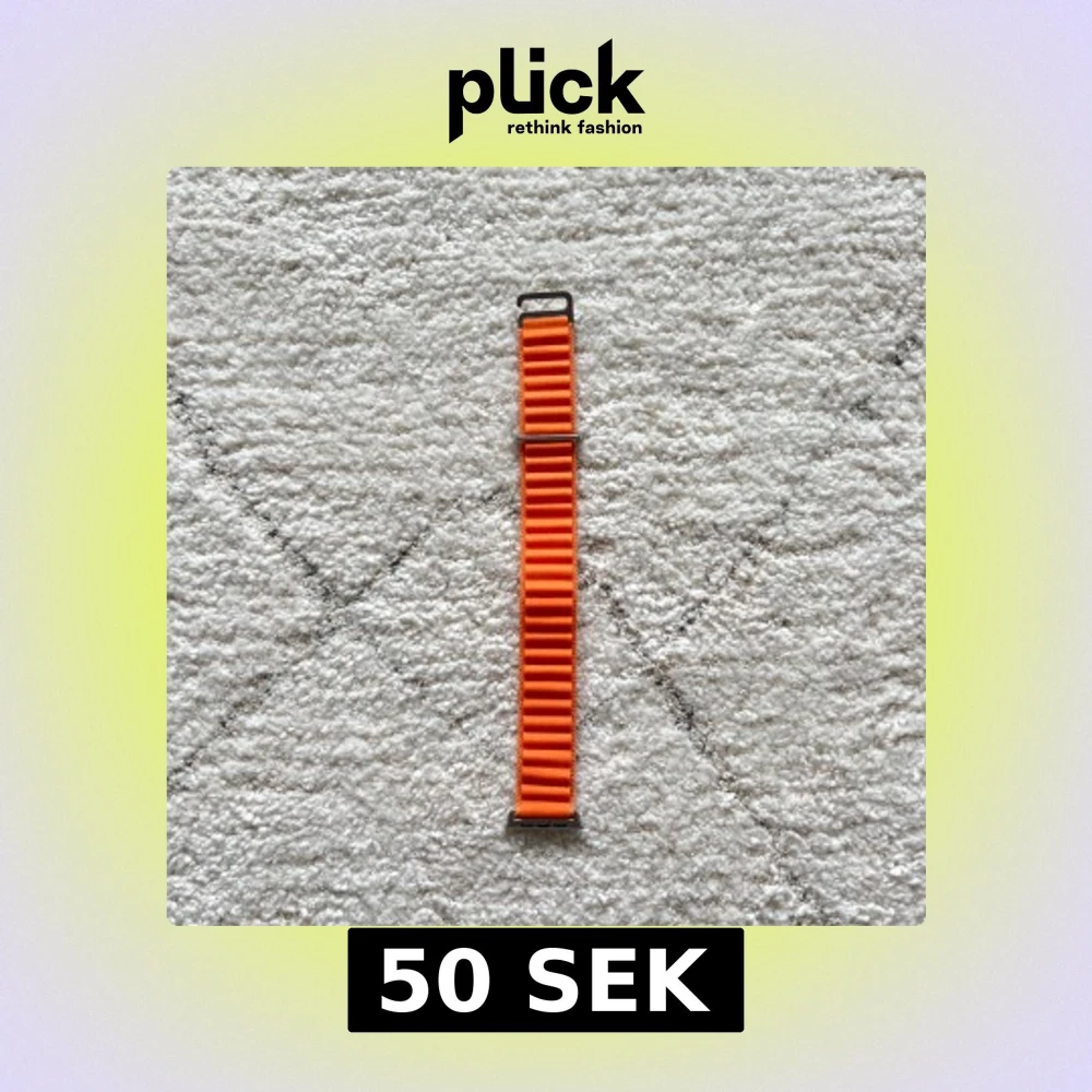 Säljer ett orange klockarmband i textil med ribbad struktur och metallspännen. Armbandet har en stark färg och passar till smartklockor med rätt fäste. Perfekt för dig som vill ge din klocka en färgklick.