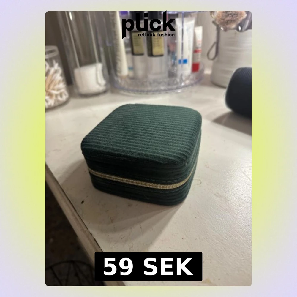 Säljer en mörkgrön smyckes necessär i manchestertyg med snygg ribbad struktur. Necessär har en praktisk dragkedja framtill i guld och en fyrkantig form som ger en cool vibe. Perfekt för dig som vill sticka ut med en unik och trendig look.