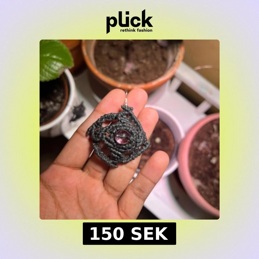 Unika örhängen i svart makramé med en lila pärla i mitten. De har en cool, bohemisk känsla och är formade i en öppen, geometrisk design. Perfekta för dig som vill sticka ut med ett personligt smycke.
