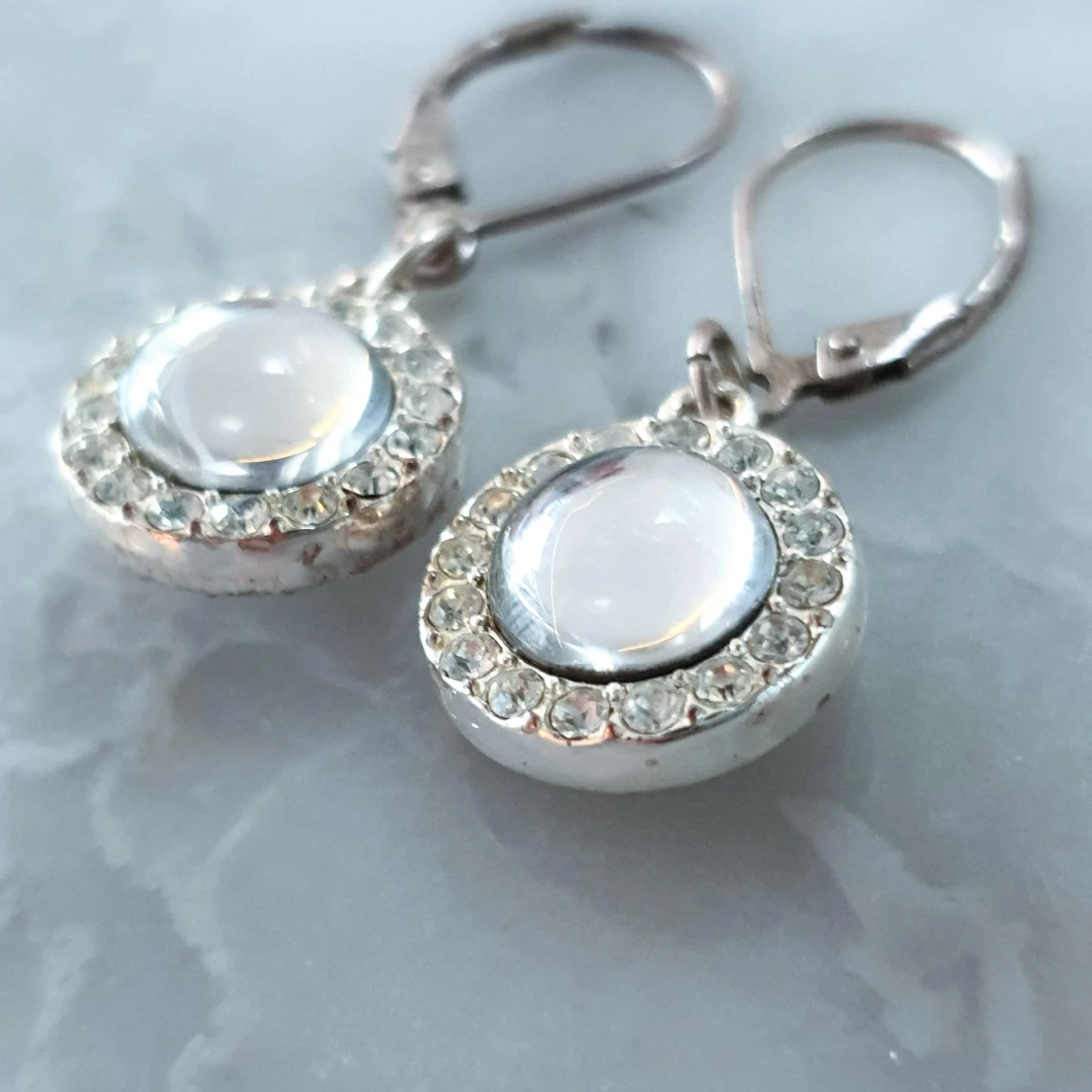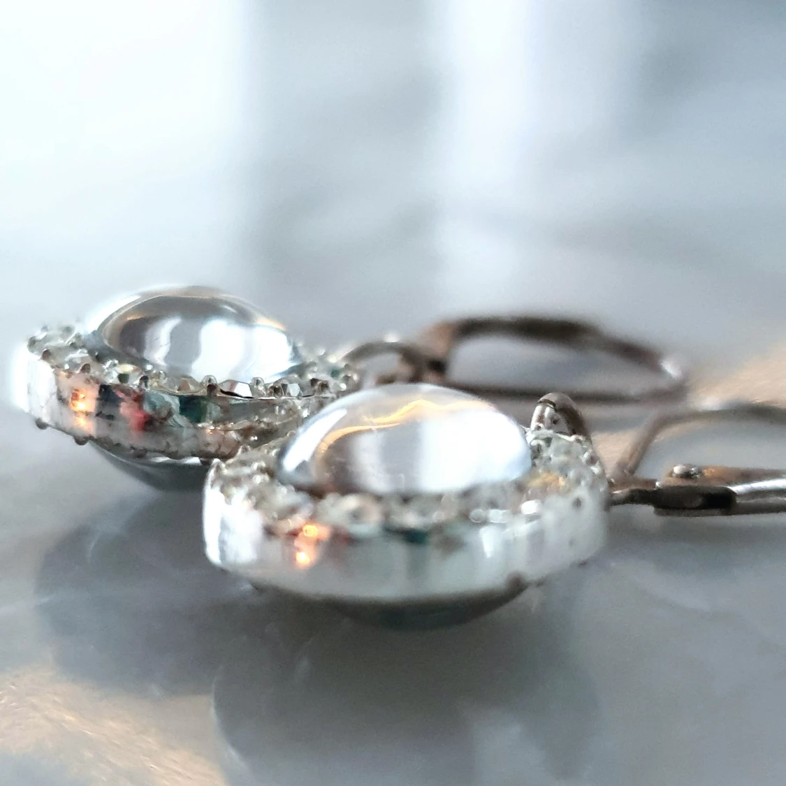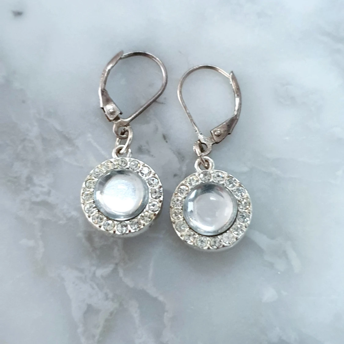 Den runda glaspärlan omgiven av små kristaller får det att se ut som att du har regndroppar som hänger från öronen. Glimmrar väldigt vackert och passar till allt.