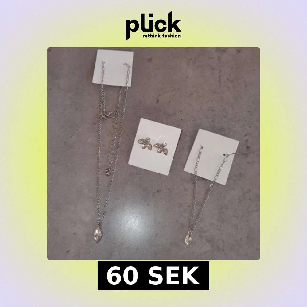 Elegant set med ett halsband och matchande armband och örhängen i silver. Halsbandet har en fin kedja med en droppformad hängande detalj såsom armbandet. Örhängena är dekorerade med små, glittrande stenar som ger en lyxig känsla.