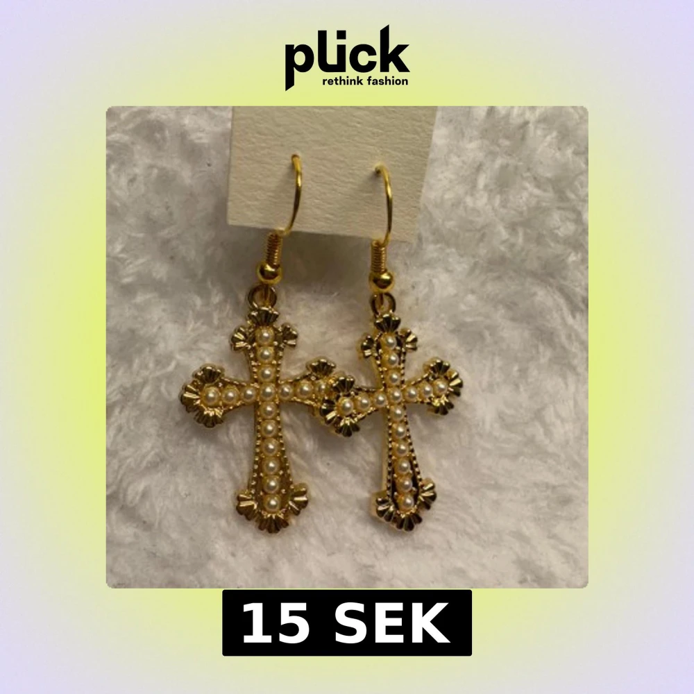Säljer ett par eleganta örhängen i form av kors, dekorerade med små vita pärlor. Örhängena är guldfärgade och har fina detaljer längs kanterna. Perfekta för dig som vill ha ett statement-smycke. Krokarna är i sterling silver