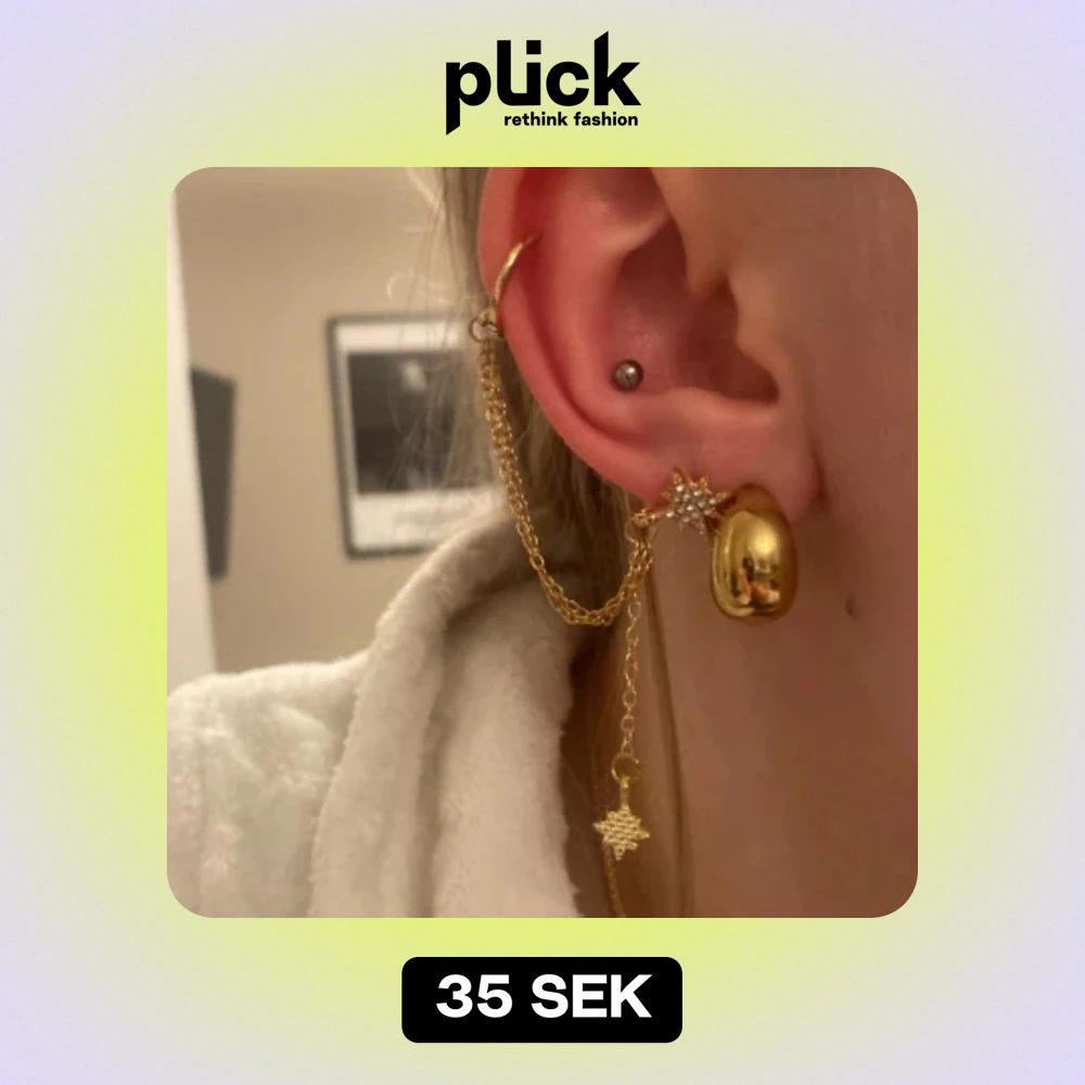 Guldigt örhänge för både vänster och höger öra. Delen som sitter i brosket är fake-örhänge så man behöver inget hål