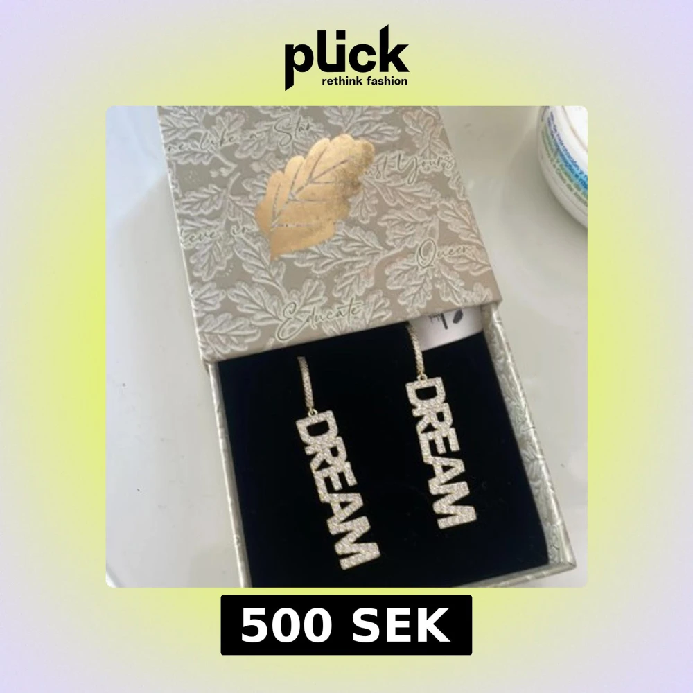 Säljer ett par örhängen från ioauk med texten DREAM i stora bokstäver. Örhängena är täckta av glittrande stenar och har en hängande design i guldfärg . Helt nya säljer för köpte fel