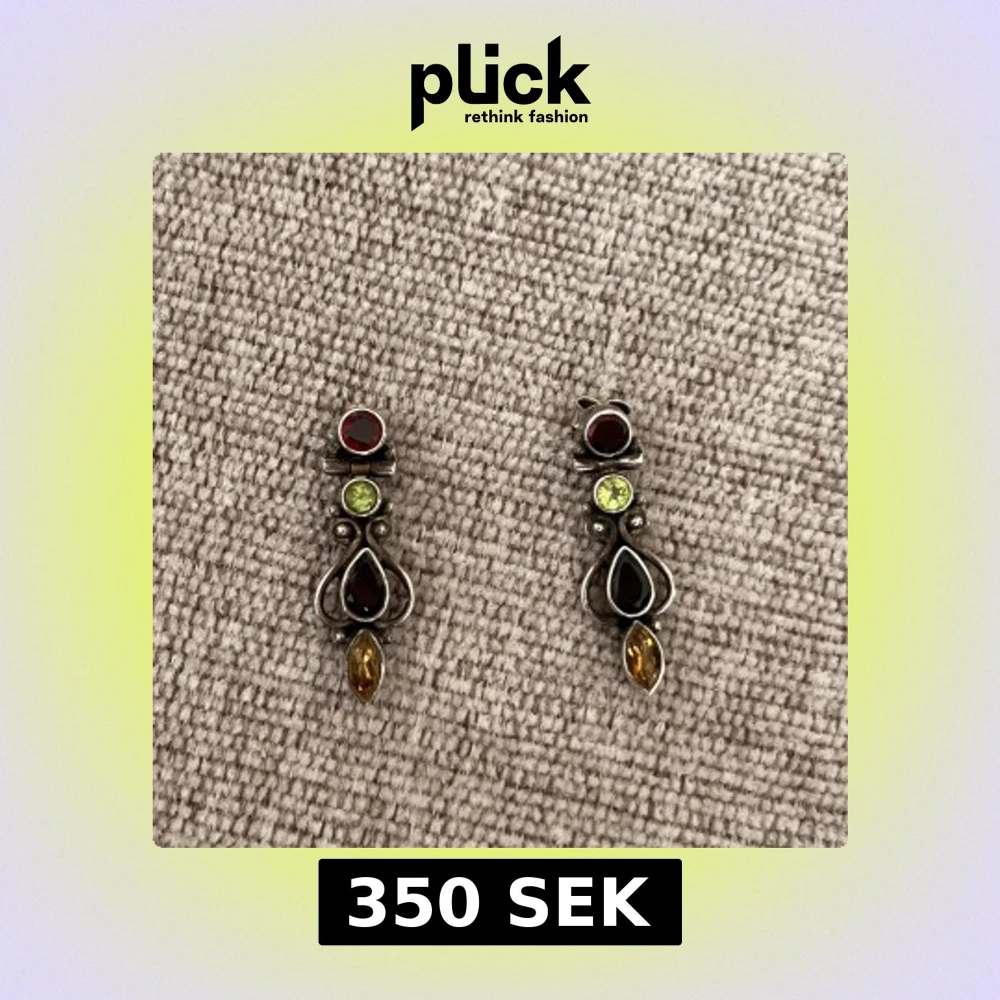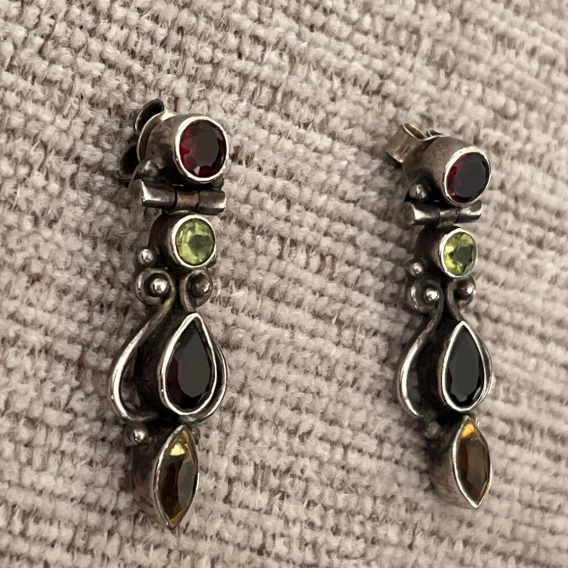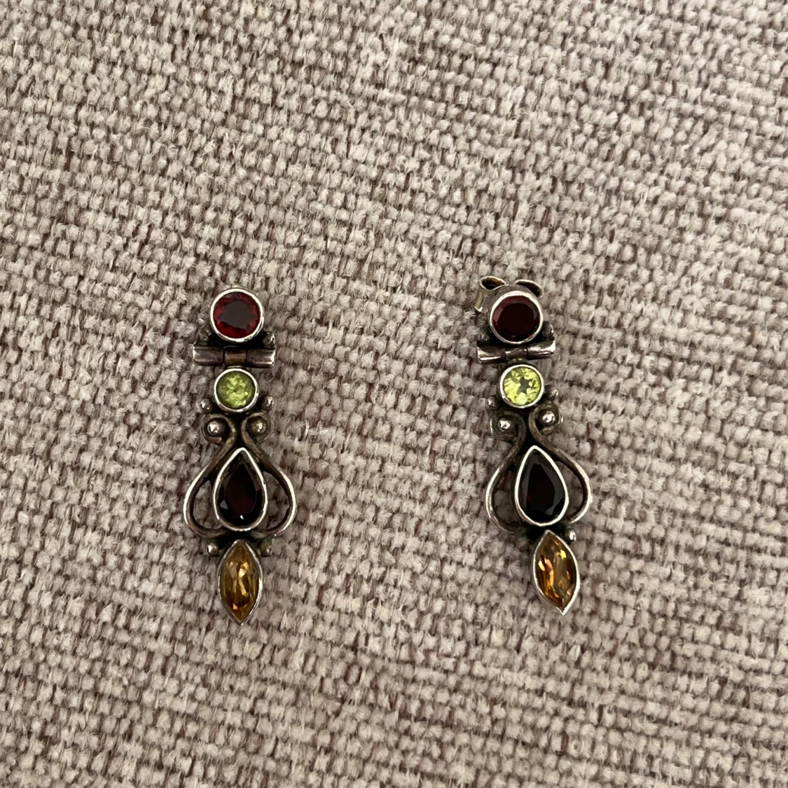 Silver örhängen vintage stil. Har 925 stämpel. Misstänker äldre modell från Pilgrim. Fina färgade stenar i olika färger. Mycket fint skick! Längd ca 3.5 cm.
