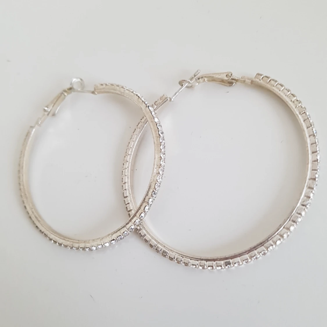 Ett par hoops i silver med små diamantliknande stenar runt hela. Mycket fina och glittrar vackert i solen. Nickelfria. Köparen står för frakten (9kr)!🌻